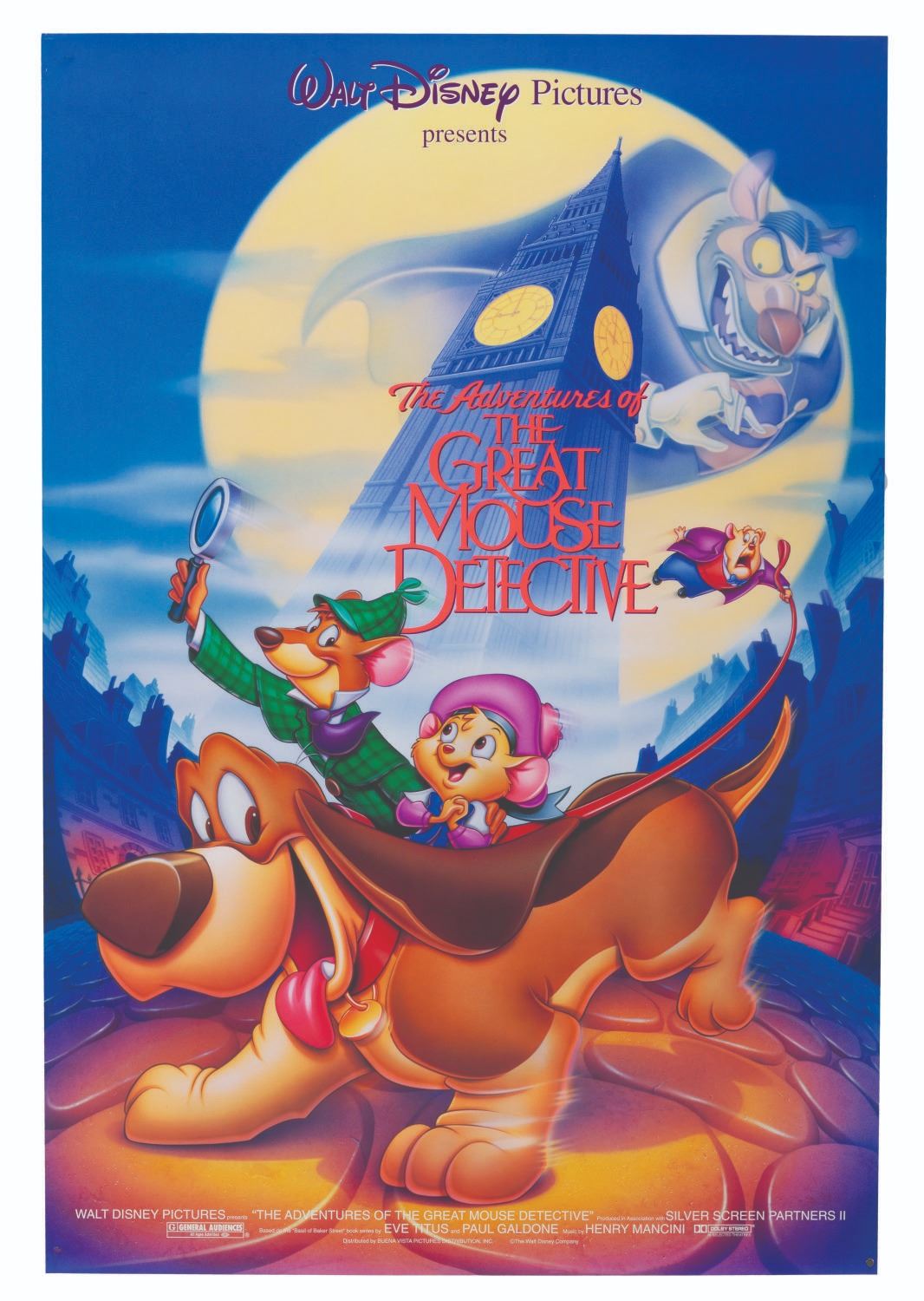 (Disney, 1992) A one-sheet for the 1992 theatrical re-release of "The Great Mouse Detective, " billed as "The Adventures of the Great Mouse Detective. " Measuring 27 " x 40 ", the poster is in very good condition with creases.