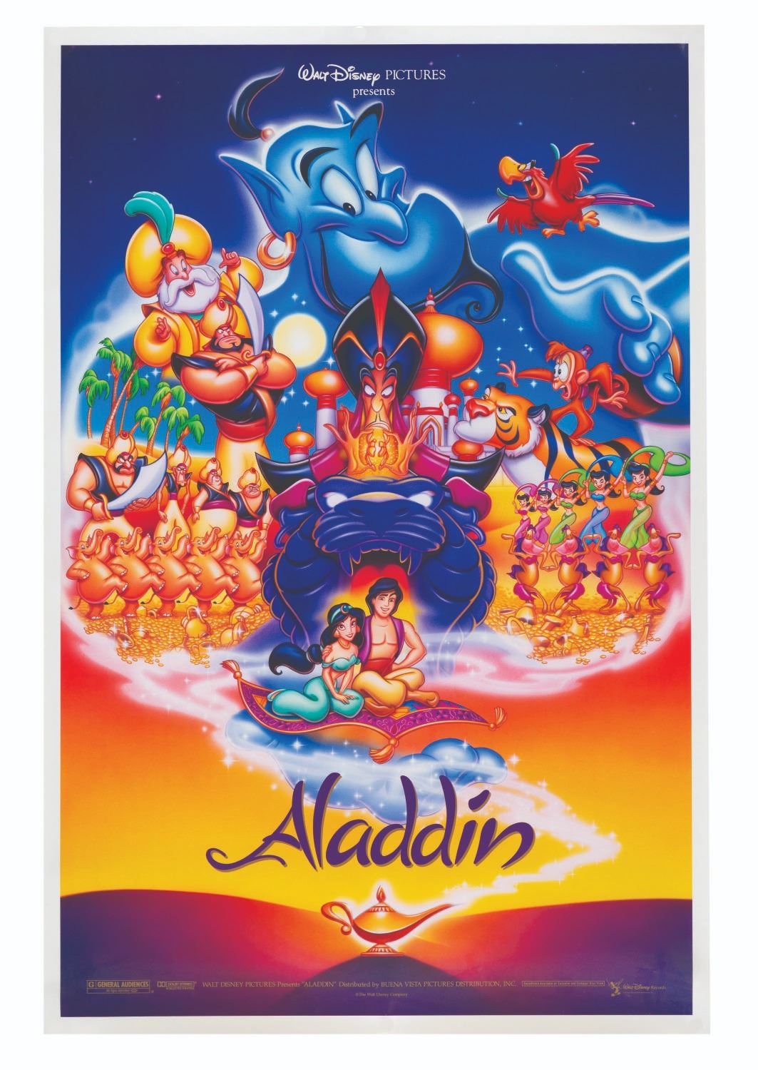 (Disney, 1992) A one-sheet for the original theatrical release of "Aladdin. " Measuring 27 " x 41 ", the poster is in very good condition with light edge wear.