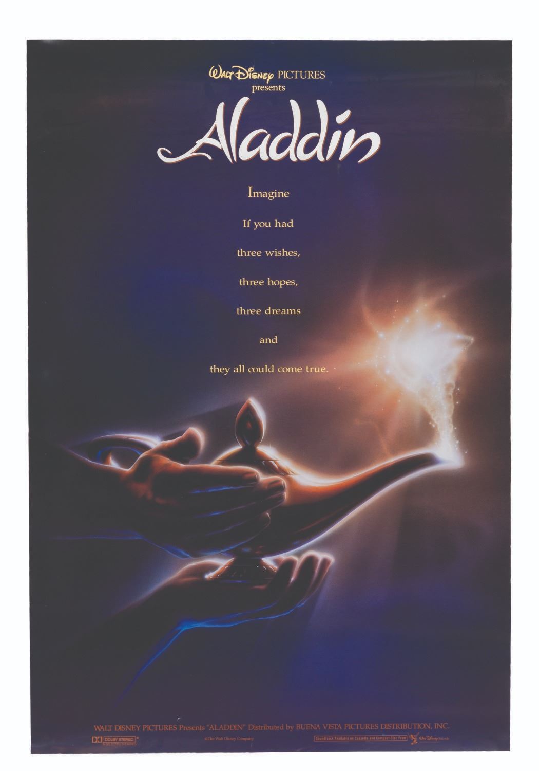 (Disney, 1992) A one-sheet for the original theatrical release of "Aladdin. " Measuring 27 " x 40 ", the poster is in good condition with light waviness and a few small creases.