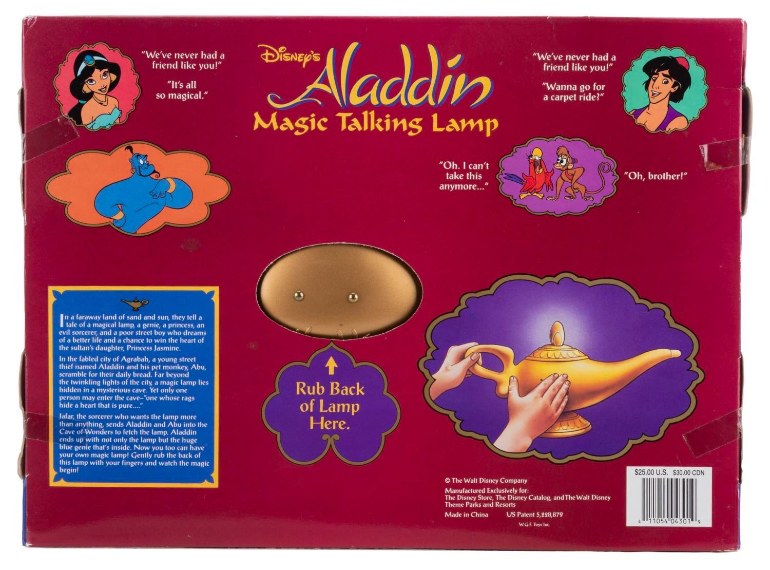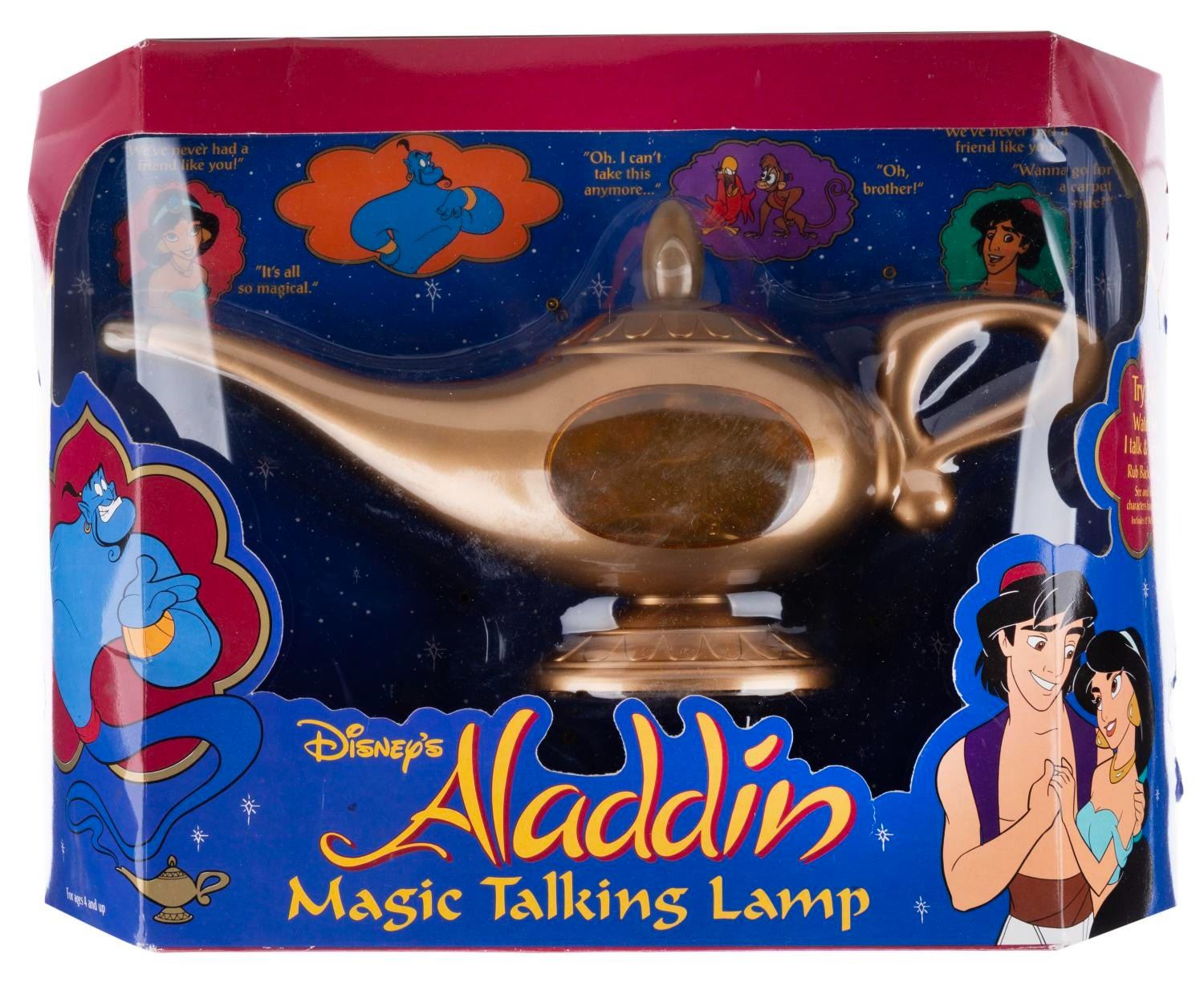 (Disney, 1990s) An "Aladdin " Magical Talking Lamp toy featuring audio from the animated film. The unopened toy has not been tested for function, likely requiring 2 AA batteries (not included). Measuring 11 " x 3 " x 5 " in its 13 " x 3 " x 9.5 " tall original packaging, the toy is in very good condition with light wear from storage, while the packaging is in good condition with a loose window, scratches, creases, and wear.