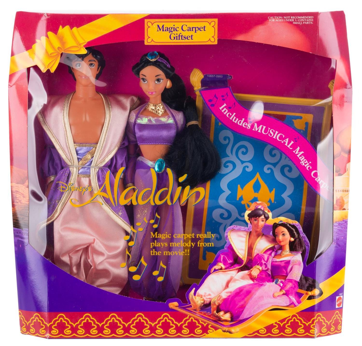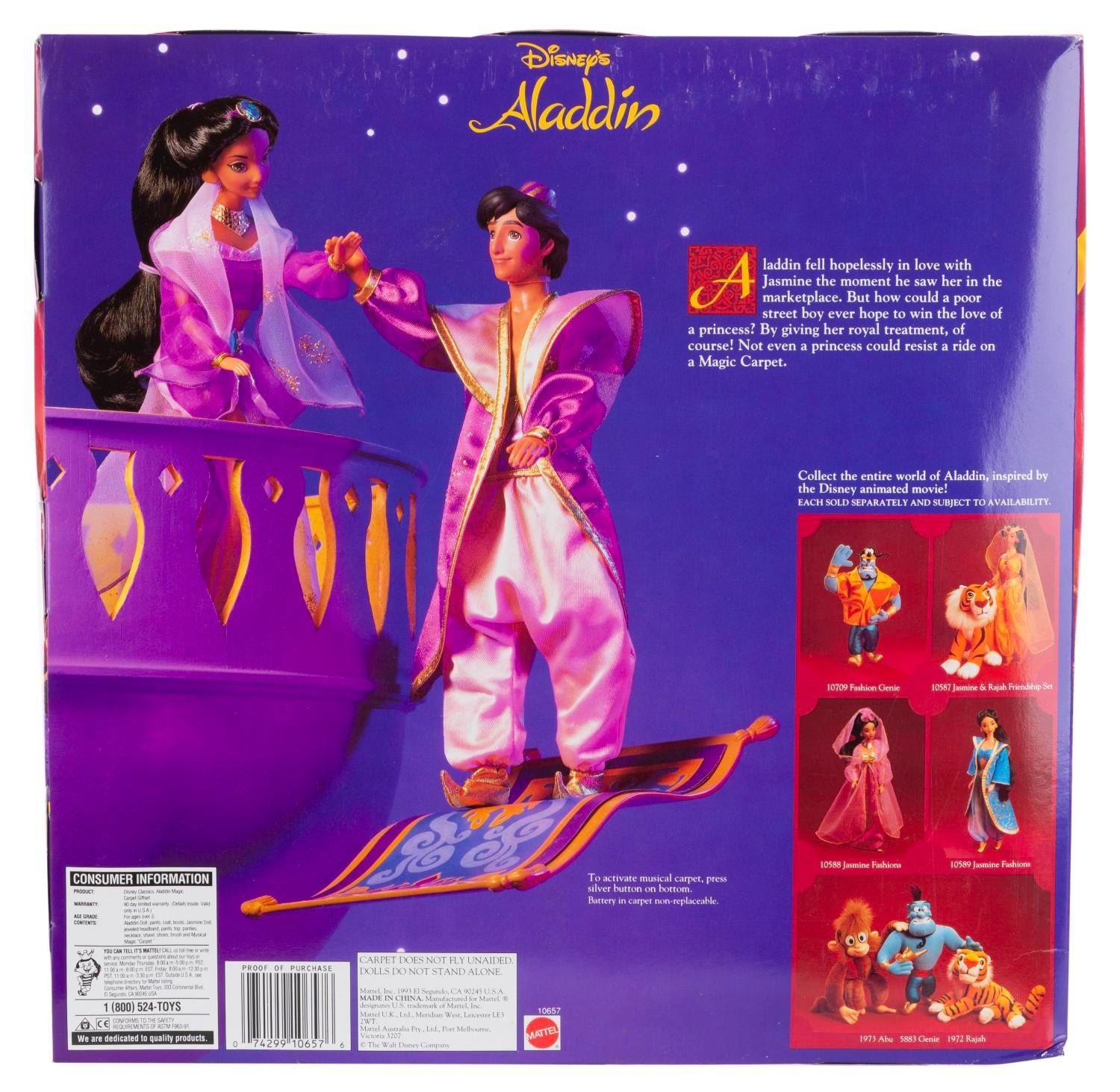 (Mattel, 1993) An "Aladdin " Magic Carpet Giftset with dolls of Aladdin and Jasmine and a musical Magic Carpet figure. Measuring 2.75 " x 13.25 " x 14 " in the original packaging, the dolls are in fine as-new condition with the packaging in good condition with light edge wear, scuffing and heavy creasing. The Magic Carpet musical feature uses a non-replaceable battery and is presumed to no longer function due to age.