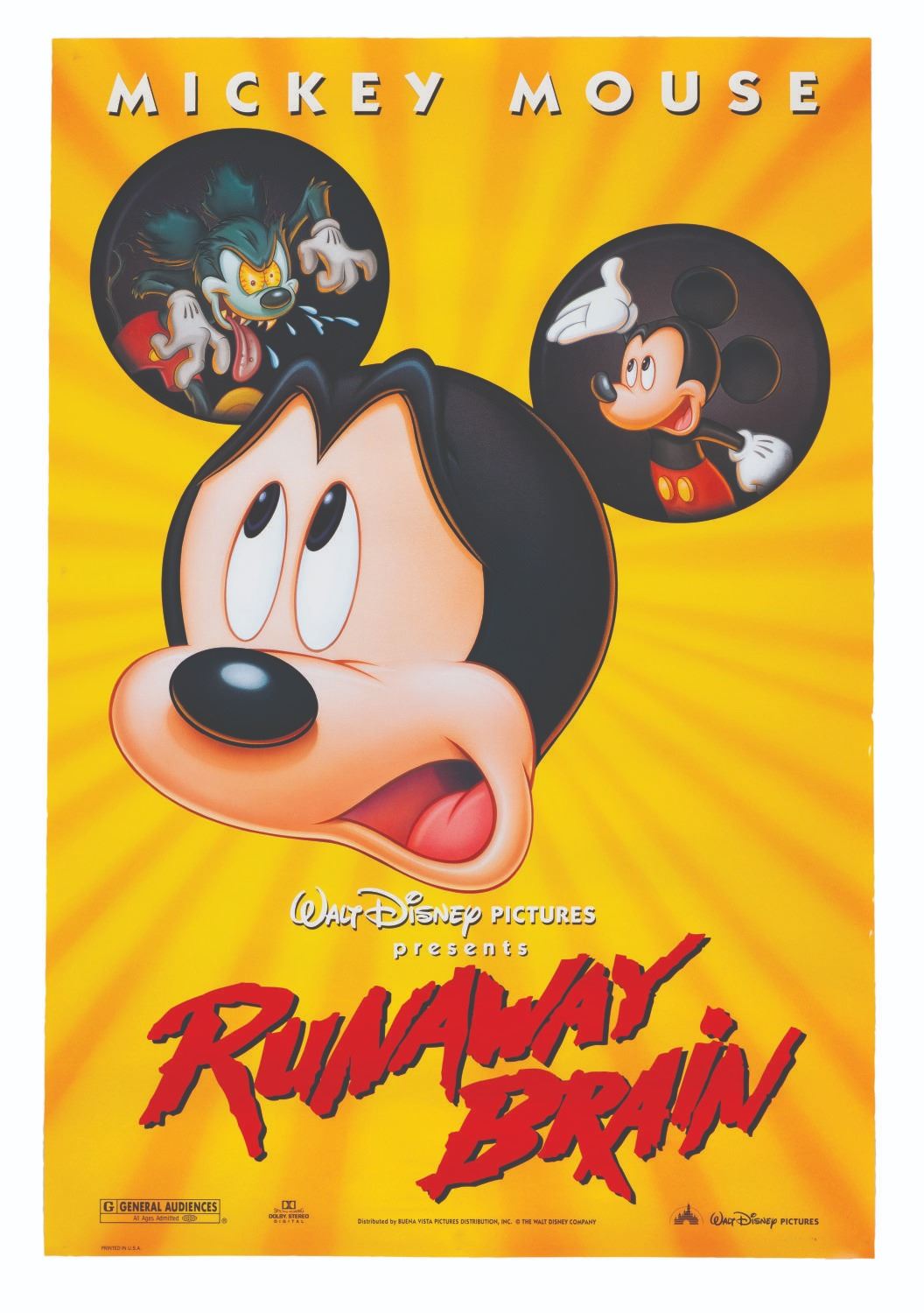 (Disney, 1995) A one-sheet for the Mickey Mouse short "Runaway Brain. " Measuring 27 " x 40 " the poster is in very good condition, with small scuffs in the bottom right edge.