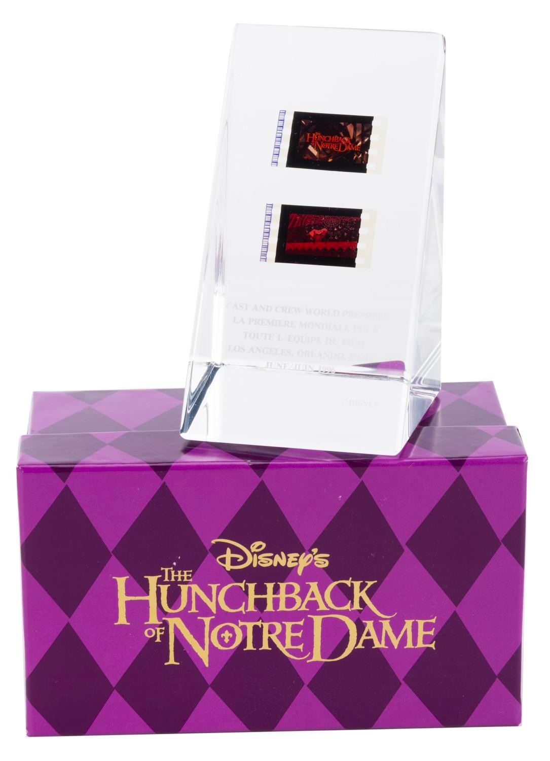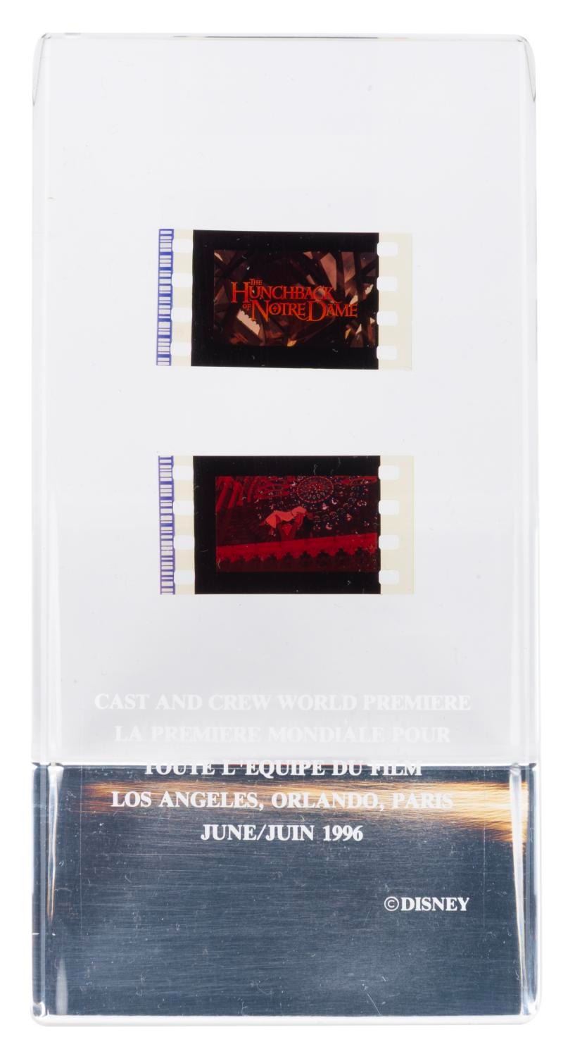 (Disney, 1996) A Cast and Crew gift from the world premiere of "Hunchback of Notre Dame " with the original box. The lucite wedge paperweight contains two 35mm frames of the film. Measuring 2.75 " x 2.75 " x 4.75 " tall, the gift comes with its original box and is in very good condition with light scratches.