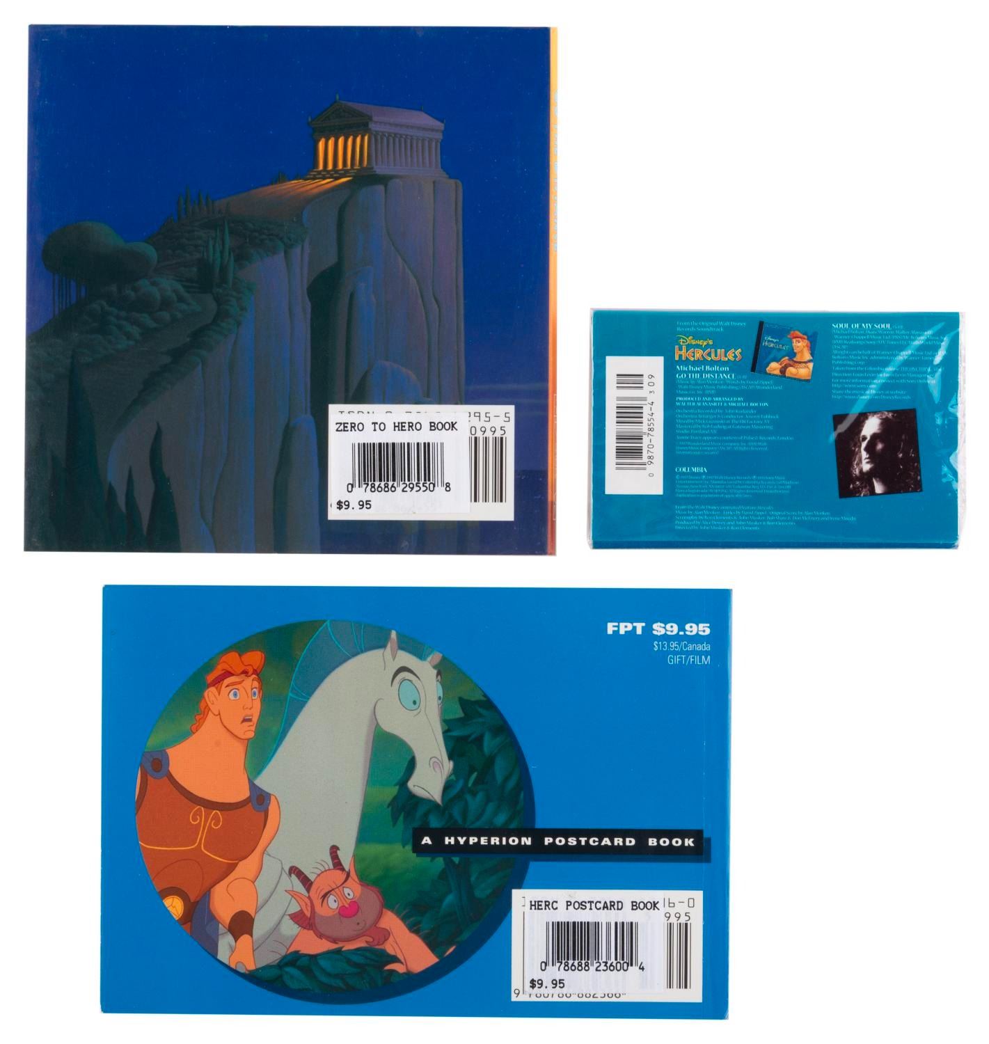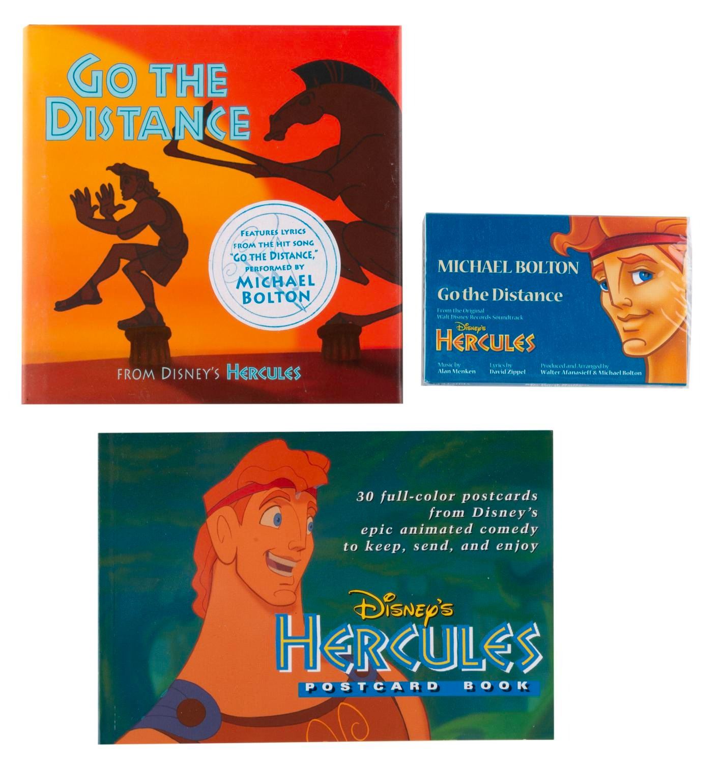 (Hyperion/Columbia, 1997) A collection of tie-in merchandise from the release of "Hercules. " Included are a 30-postcard book, a "Go the Distance " book featuring the lyrics to Michael Bolton's song, and an unopened cassette single of the hit song. Ranging in size from the 2.5 " x 4 " cassette to the 6 " x 6 " book, the items are in very good to fine condition with light wear.