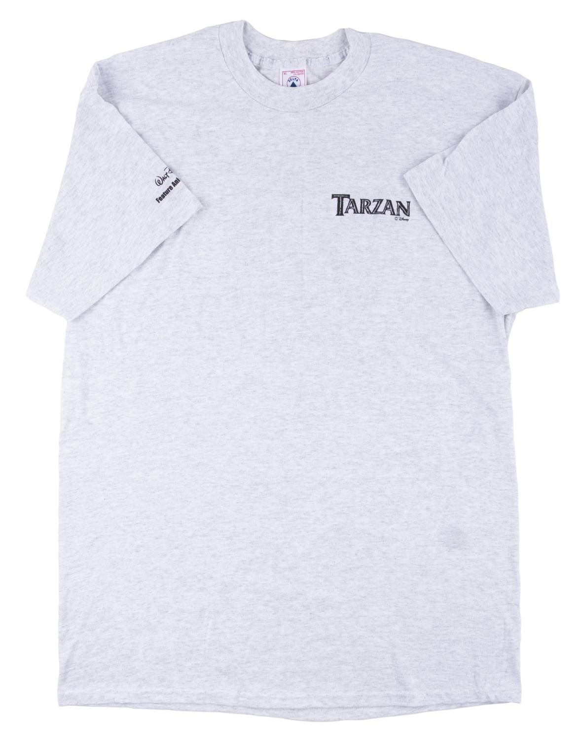 (Disney, 1999) A Feature Animation crew t-shirt from "Tarzan " featuring Glen Keane’s design of the character on the back. Labeled a size XL, the shirt is in fine unused condition.