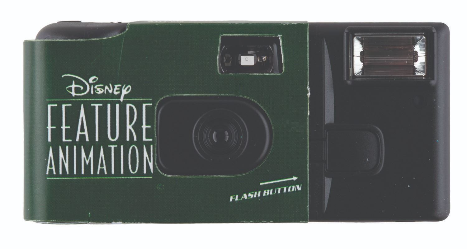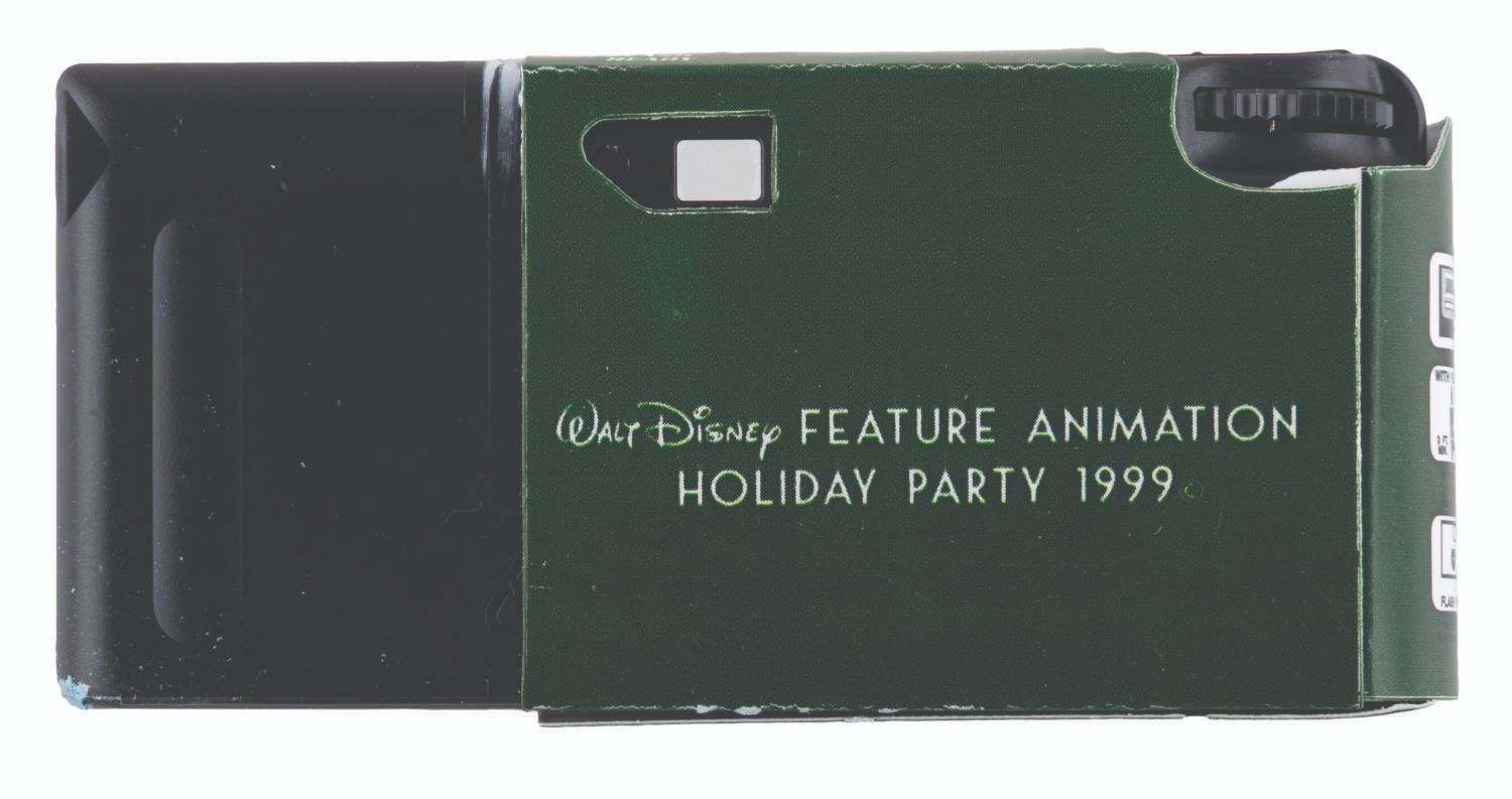 (Disney, 1999) A disposable film camera from the Walt Disney Feature Animation 1999 Holiday Party. Measuring 1 " x 2 " x 4.25 ", the camera is in good, untested condition with edge wear and evidence of battery failure.