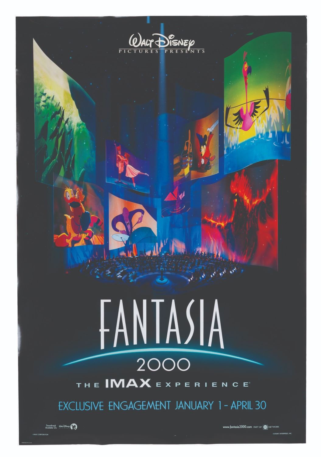 (Disney, 1999) A one-sheet for the "Fantasia 2000 " IMAX experience, with an exclusive engagement from January 1 to April 30. Measuring 27 " x 40 ", the poster is in very good condition with very light handling wear.