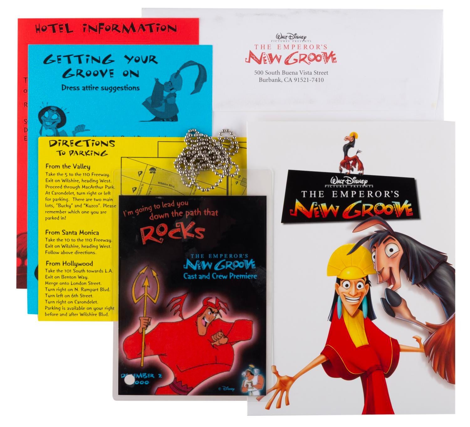 (Disney, 2000) An invitation to the cast and crew premiere and wrap party for "The Emperor's New Groove. " Included are the invitation card, dress code, directions, hotel information, and a laminated map of the Park Plaza. Ranging in size from 4 " x 5.5 " to 5 " x 7 ", the items are in very good to fine condition with light handling wear.