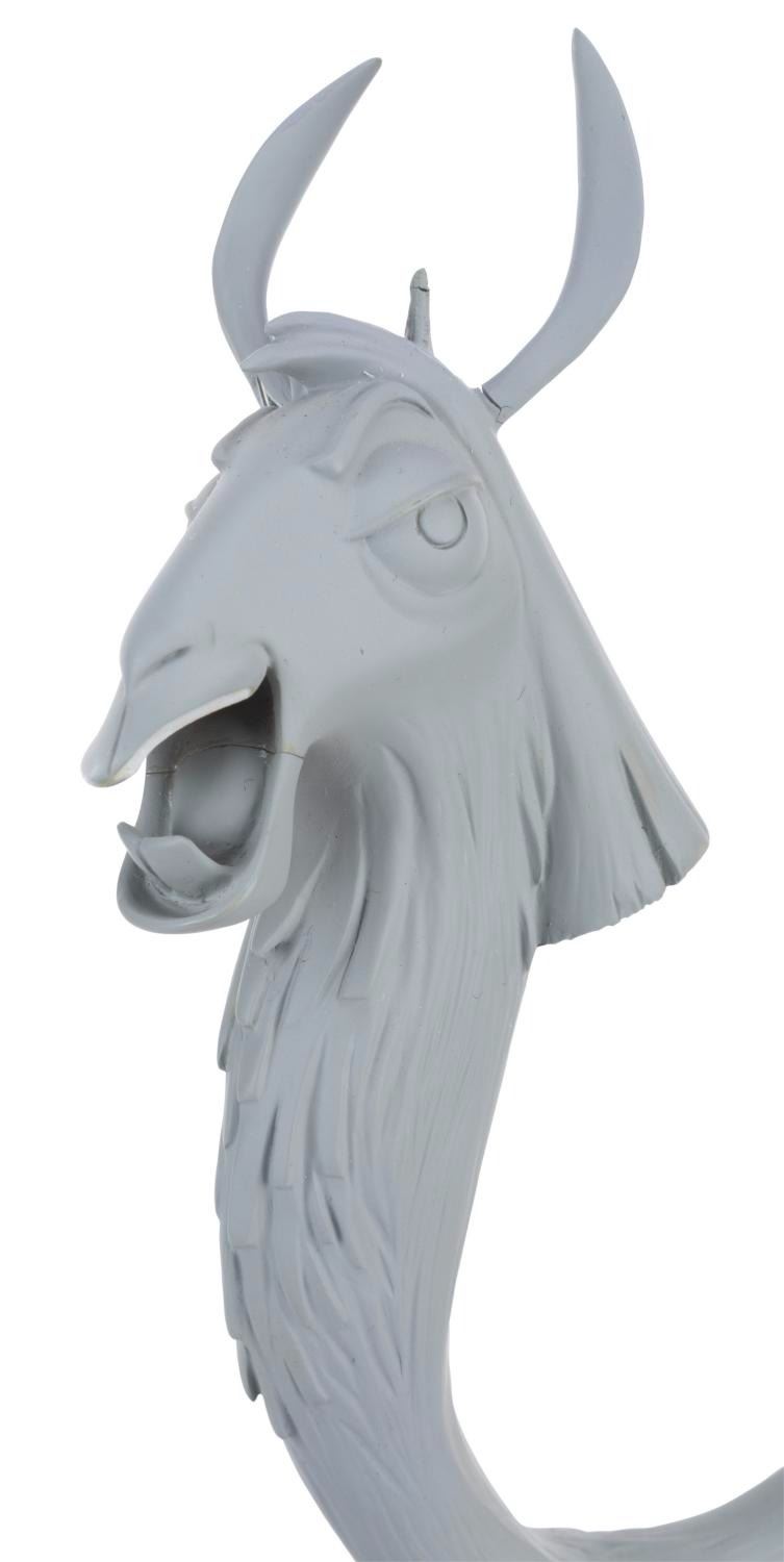 (Disney, 2000) A damaged limited edition Kuzco maquette, originally given as a gift to attendees of the Feature Animation Cast and Crew screening of "The Emperor's New Groove " in December of 2000. This maquette is numbered 1691/2400. Measuring 8.75 " x 6 " x 10.75 " tall, the maquette displays in fair condition with a 0.5 " piece of the lip broken and missing, a crack line in the jaw, the right ear broken at the base with the internal wire fully exposed, the tail broken at the base, and a 0.5 " chip missing from one corner of the base.