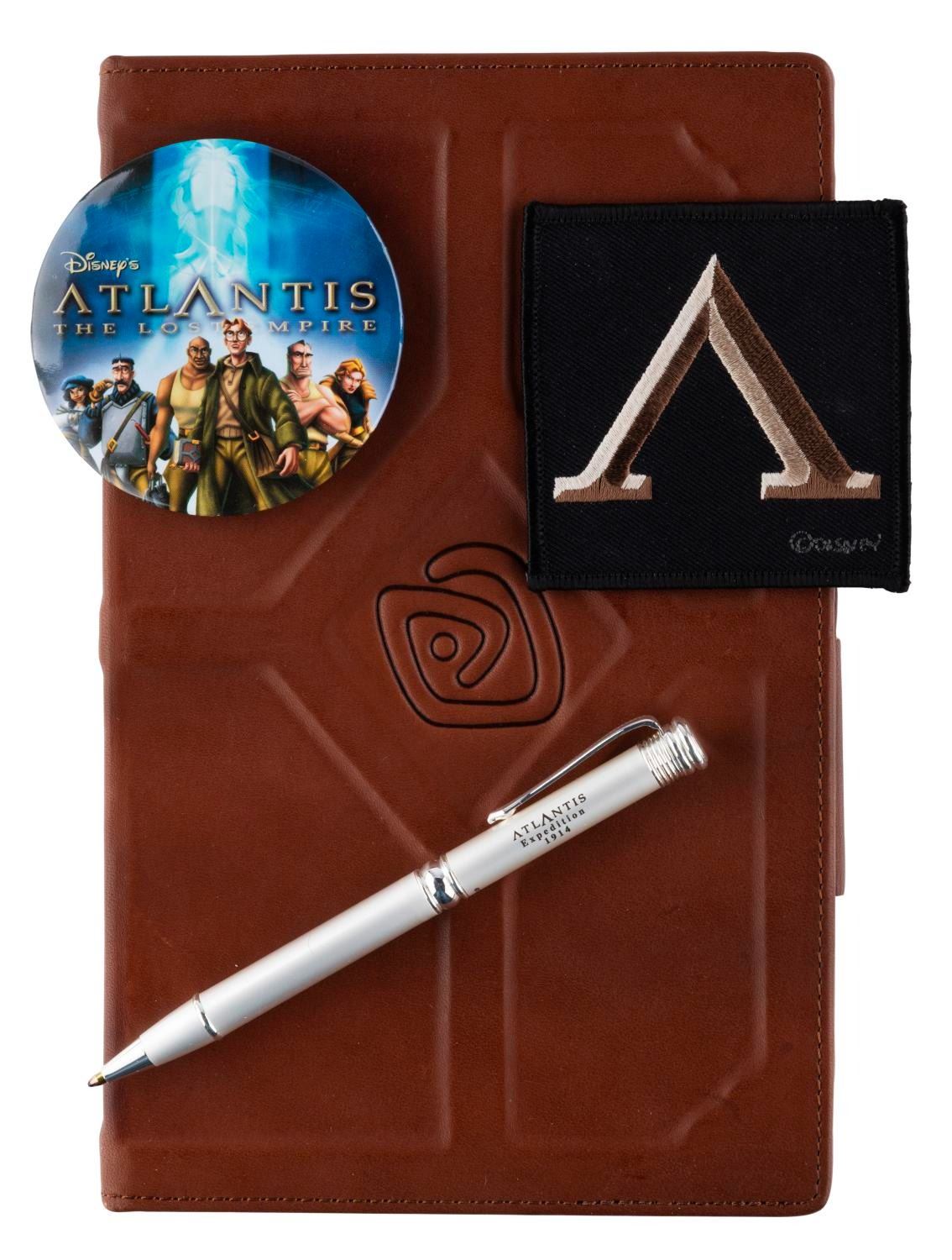 (Disney, 2001) An "Atlantis: The Lost Empire " Feature Animation crew gift set, including a leather-bound sketchbook with pen, a pinback button, and an embroidered iron-on patch. Measuring 3 " x 3 " to 6 " x 9 ", the set is in very good, new condition with light wear from age and handling.