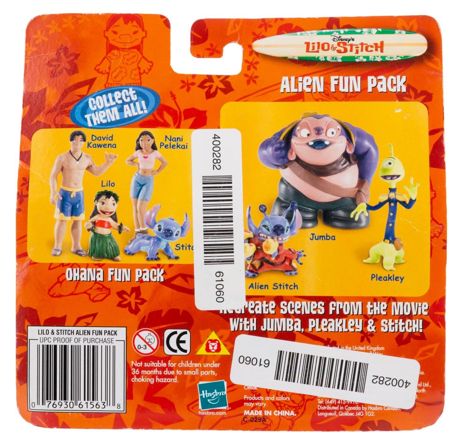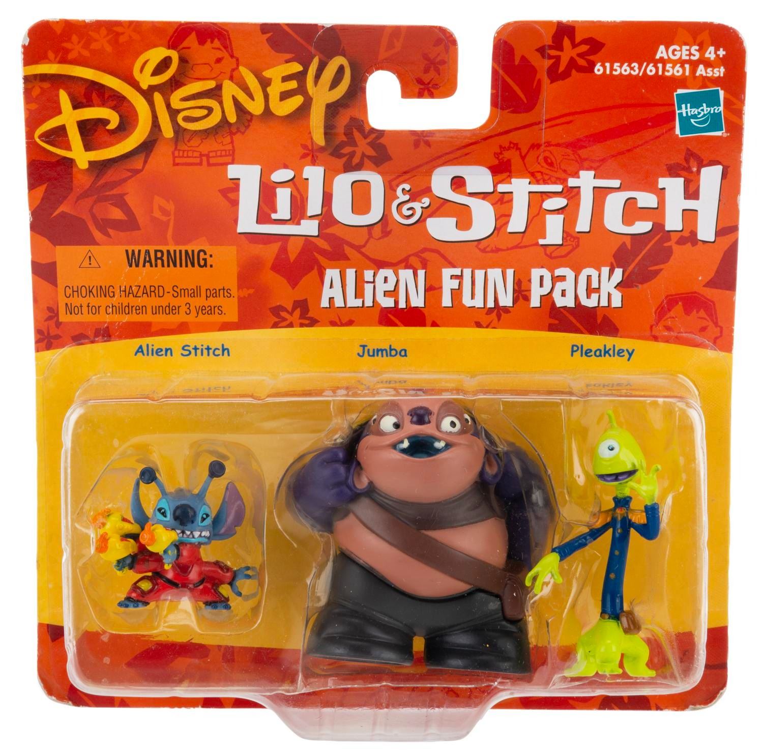 (Hasbro, 2002) A "Lilo & Stitch " Alien Fun Pack featuring figurines of Jumba, Pleakley, and Stitch. Measuring 2 " x 7 " x 7 ", the set is in fine condition in the original packaging. The packaging exhibits moderate creasing and edge wear.