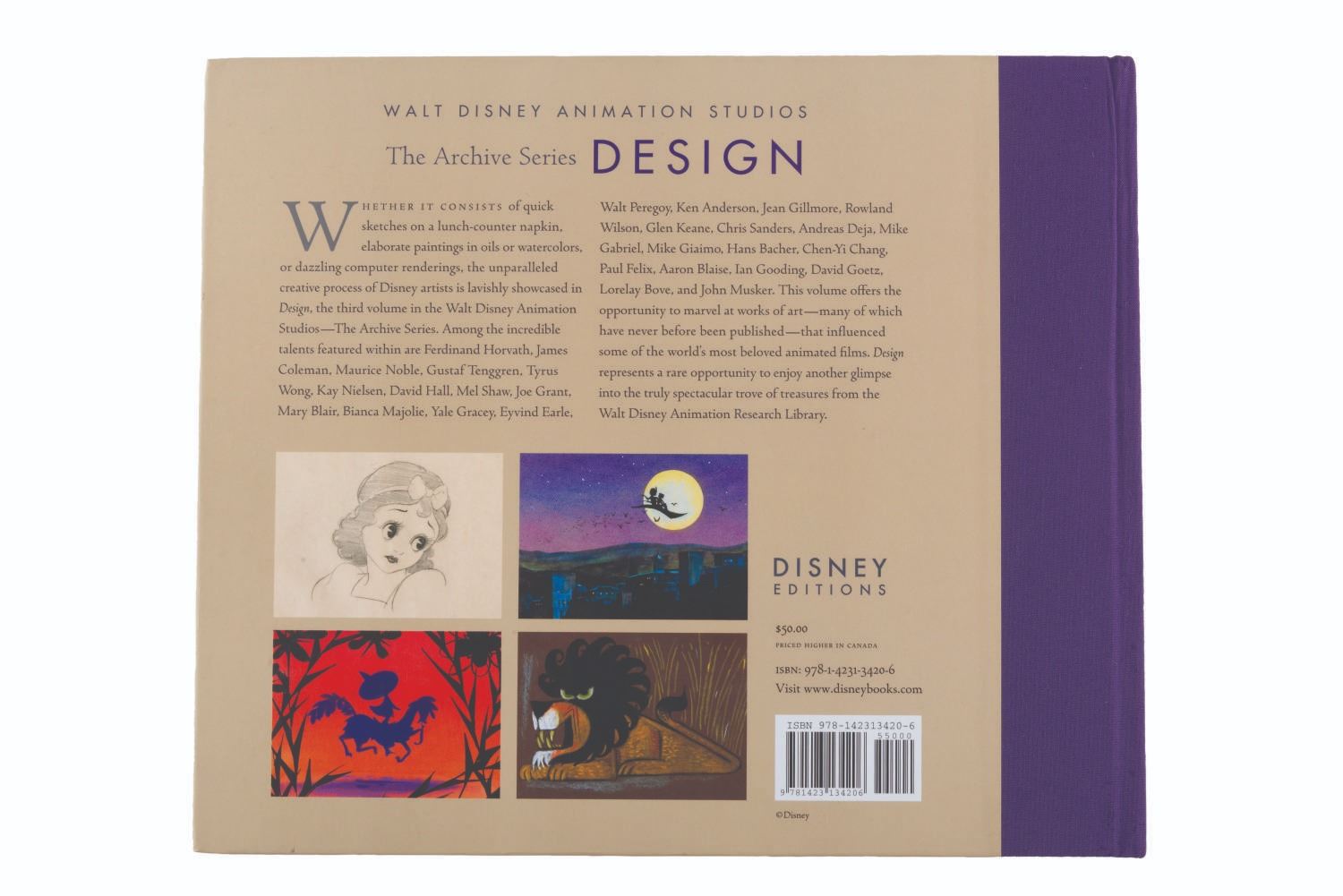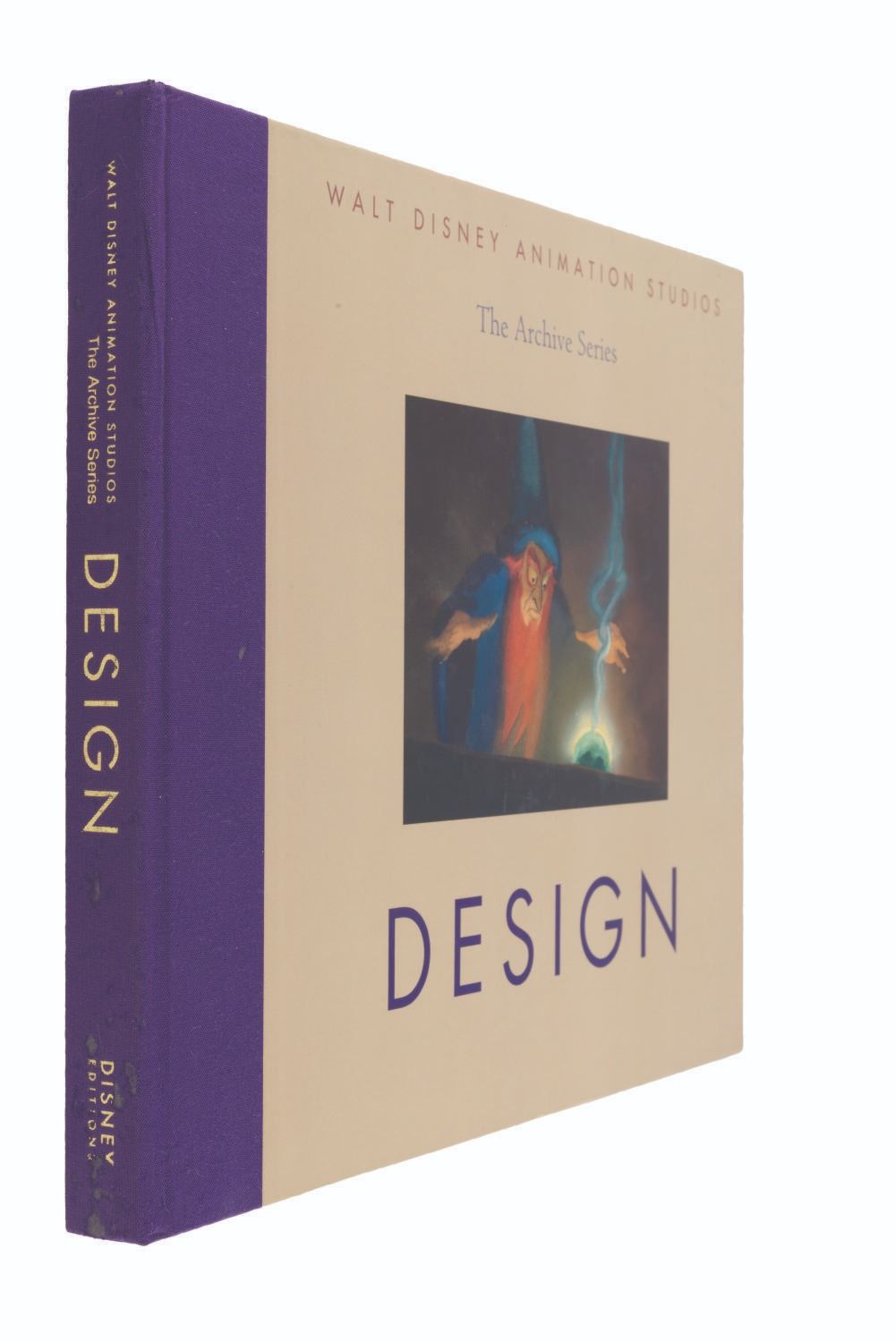 (Disney Editions, 2010) Book three of the Walt Disney Animation Archive Series: "Design. " The 256-page hardcover focuses on the Studio’s creative process, showcasing concept sketches, paintings, and computer renderings from the talents of Gustaf Tenggren, Tyrus Wong, Eyvind Earle, Mary Blair, and more. Measuring 13 " x 11 ", the book is in very good to fine condition with very light handling wear to the cover.