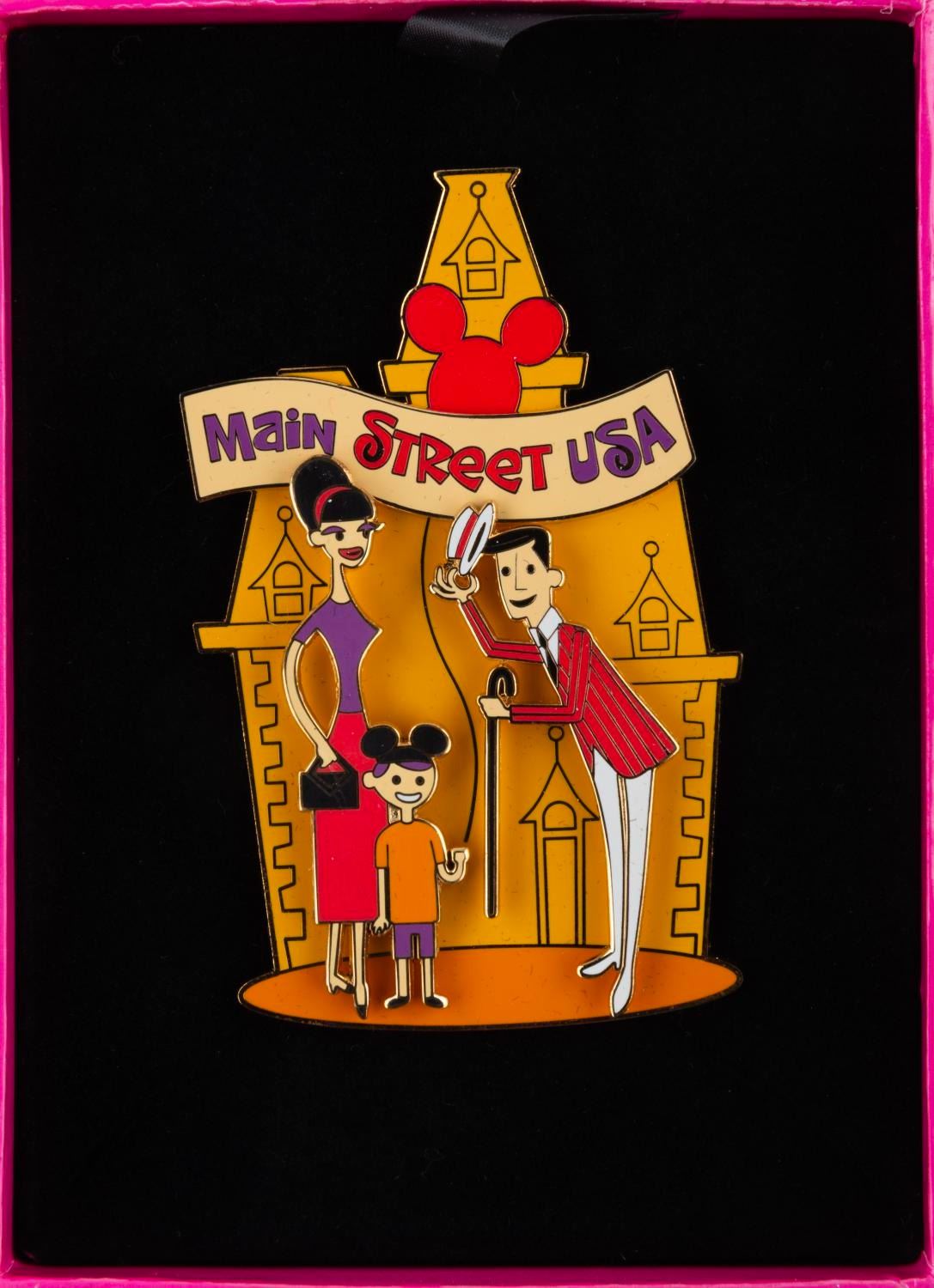 (Disneyland, 2005) A Main Street, U.S.A. jumbo pin designed by the artist SHAG for Disneyland's 50th anniversary, released in a limited edition of 1955. Measuring 3.5 " x 2.25 ", the pin is in fine condition with the original box.