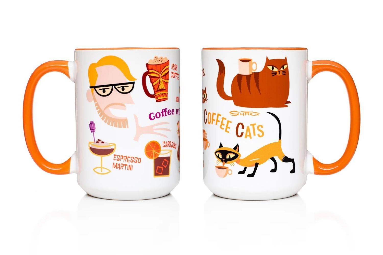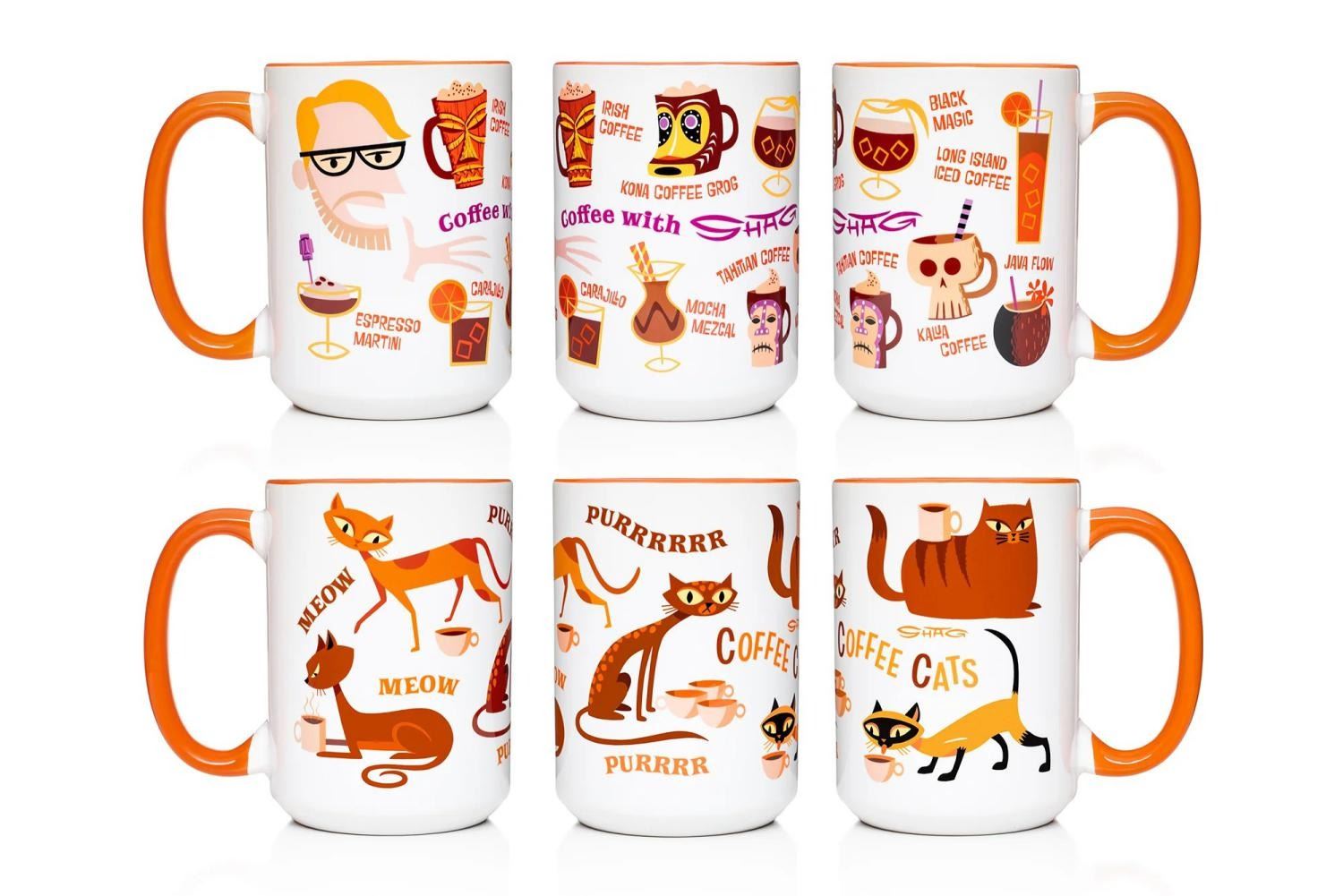 (SHAG, 2010s-20s) A pair of SHAG "Coffee Cats " and "Coffee with Shag " mugs. Both dishwasher and microwave-safe mugs hold 15oz and are in fine condition.