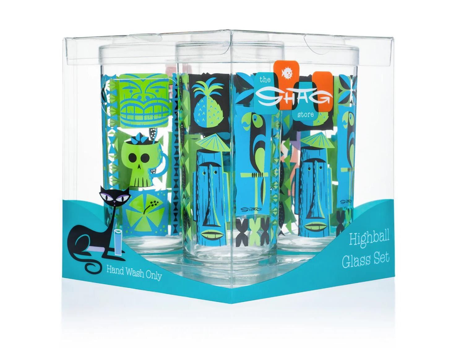(SHAG, 2010s-20s) A four-piece "Tapa " Tiki Highball Glass set designed by SHAG. Measuring 6 " tall and 3 " in diameter each, the 16oz glasses are in fine condition.