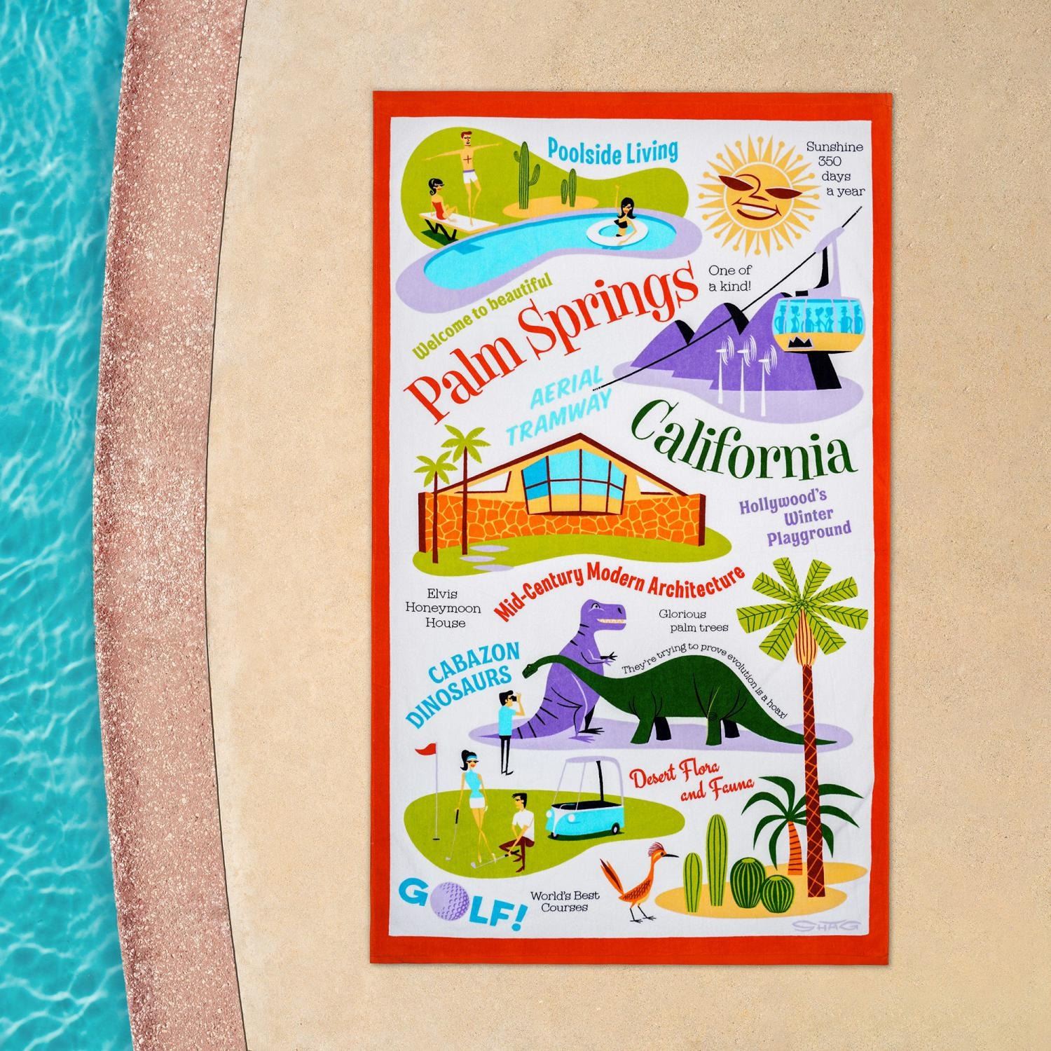 (SHAG, 2010s-20s) A "Palm Springs California " Beach Towel designed by SHAG, celebrating the iconic lifestyle, landmarks, and memorable scenes of the city. Measuring approximately 60 " x 35 ", the 100% cotton towel is in fine condition.