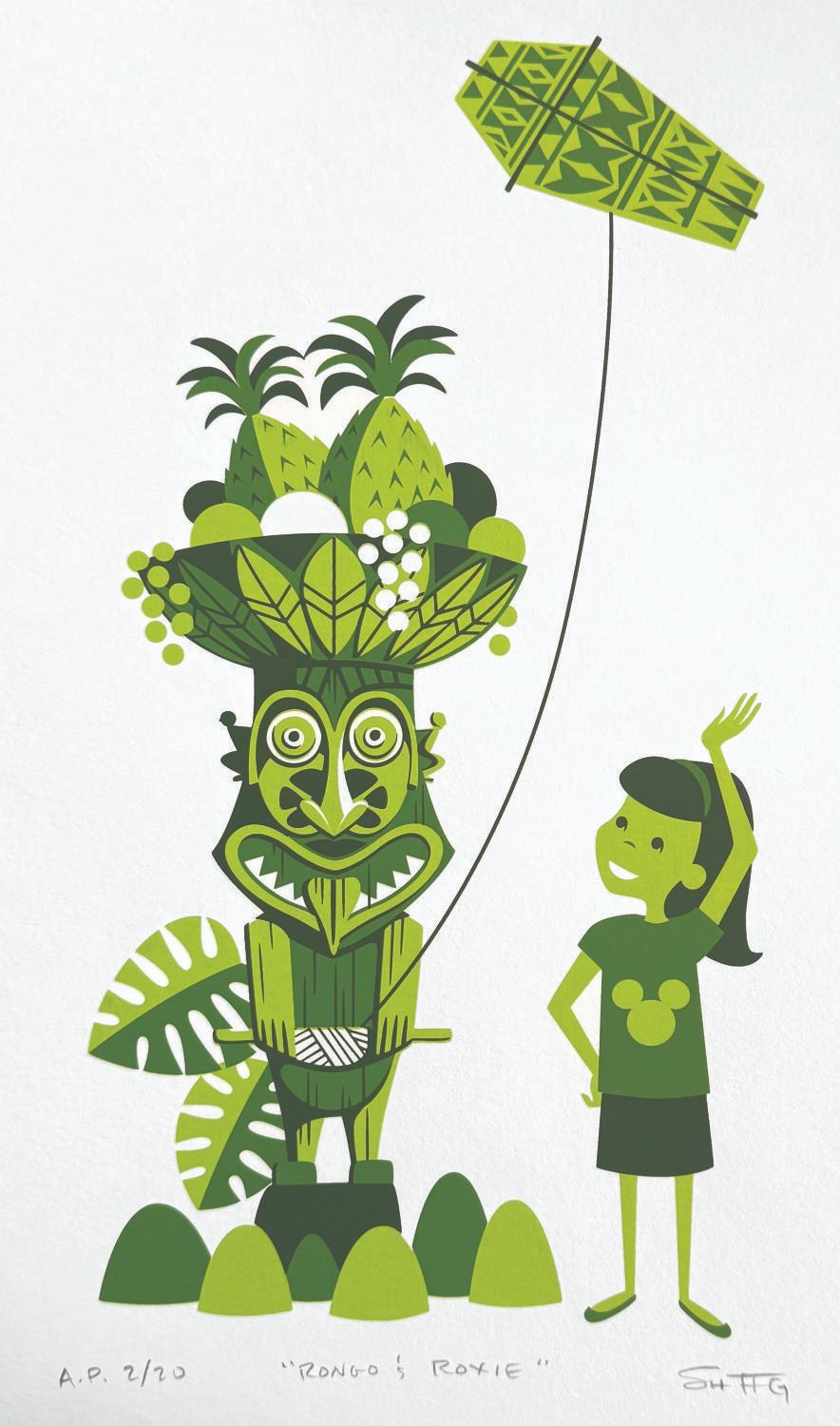 (Disneyland, 2013) A signed "Rongo and Roxie " print by SHAG for the 50th anniversary of Walt Disney’s Enchanted Tiki Room. SHAG signed the bottom right of the artist’s proof, numbered 2 of only 20. Measuring 8 " x 14 ", the print is in fine condition.