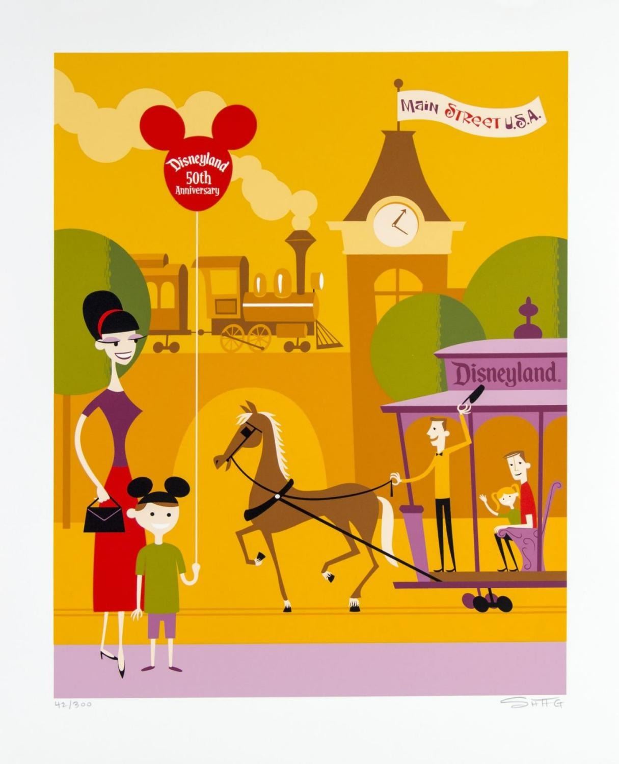 (Disneyland, 2005) A Main Street, U.S.A. serigraph print by SHAG from the Original Lands Collection, created for the 50th Anniversary of Disneyland. The print is hand-numbered 42 of 300 and signed by SHAG at the bottom right in graphite. Measuring 27 " x 21 ", the print is in very good condition with minor edge wear.