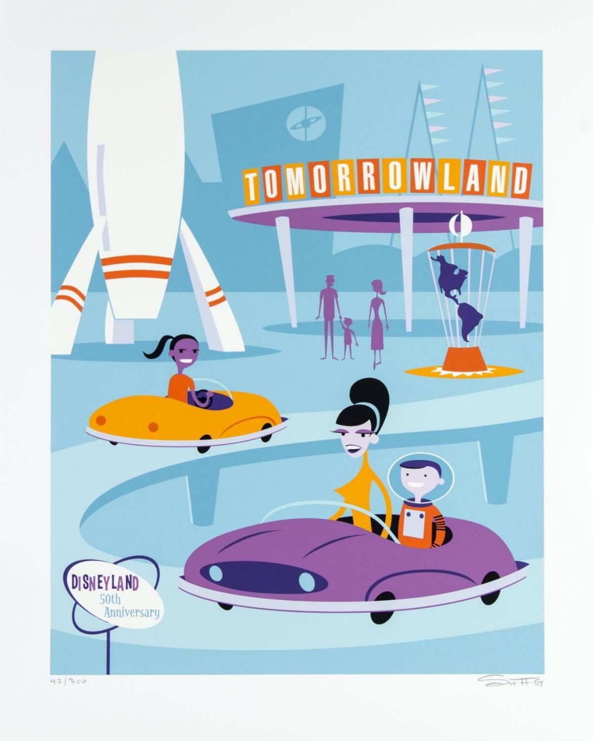 (Disneyland, 2005) A Tomorrowland serigraph print by SHAG from the Original Lands Collection, created for the 50th Anniversary of Disneyland. The print is hand-numbered 42 of 300 and signed by SHAG at the bottom right in graphite. Measuring 27 " x 21 ", the print is in very good condition with minor edge wear.