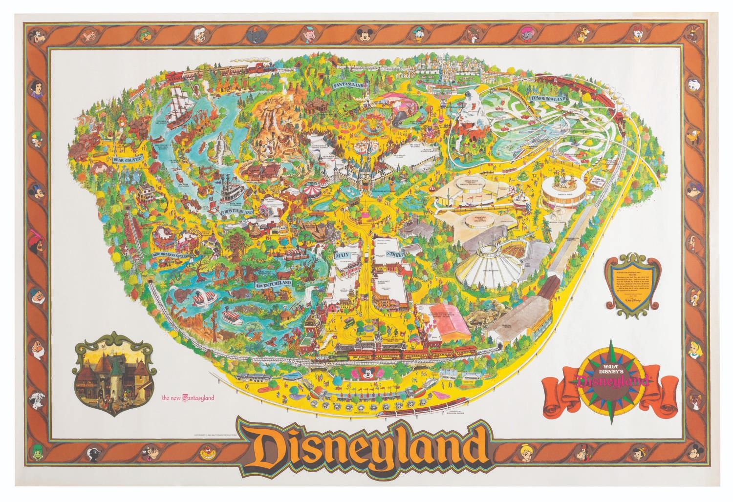 (Disneyland, 1983) A large souvenir map of Disneyland from 1983, with a graphic promoting New Fantasyland. Unlike most examples of this map which were sold folded, this map was sold rolled and therefore lacks the typical fold lines. Measuring 29.5 " x 44 ", the map is in fine condition with very light edge wear and light discoloration in the top right corner from storage.