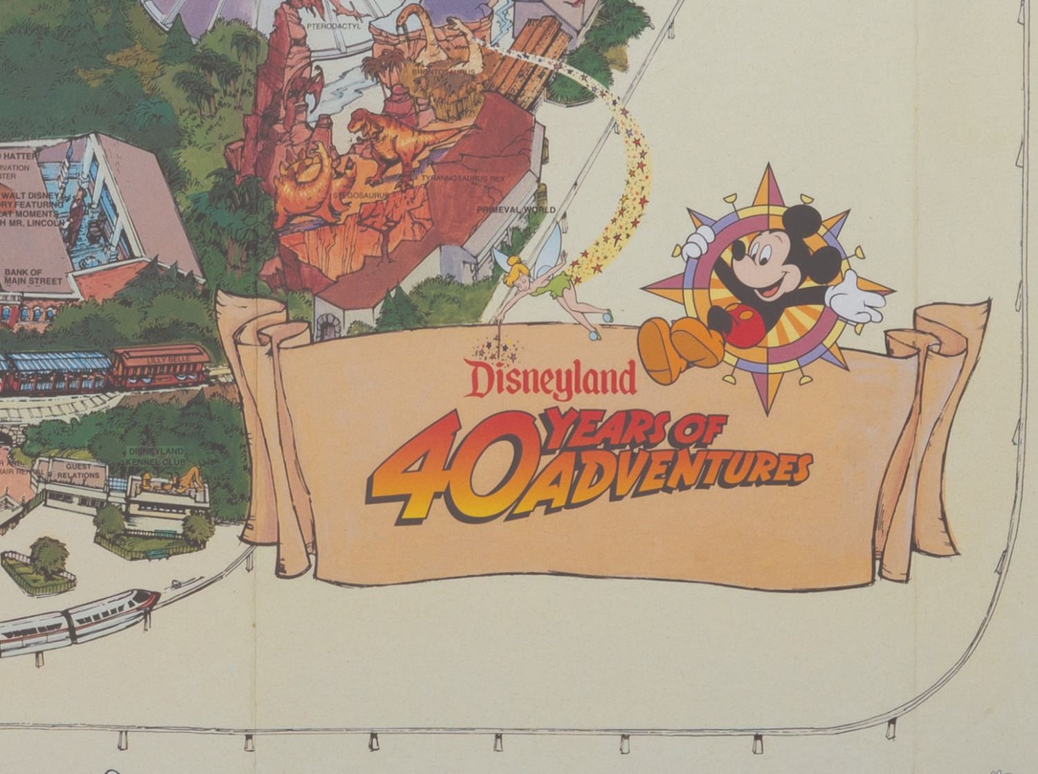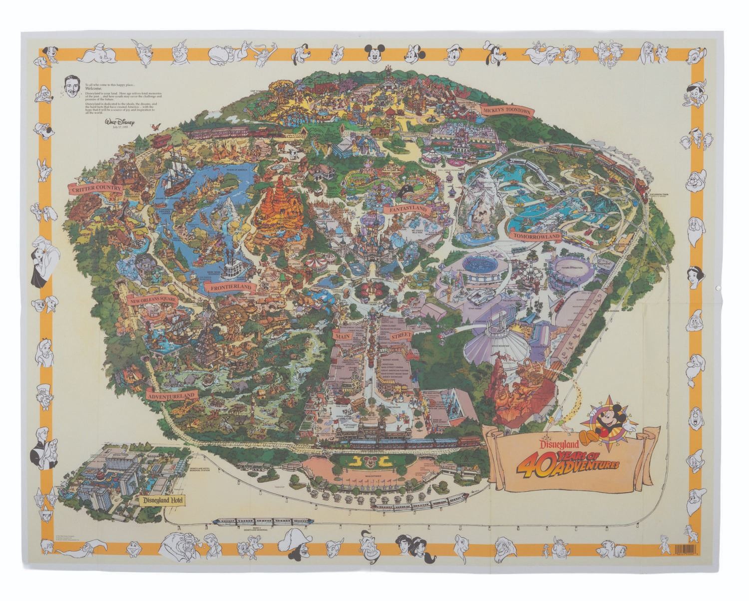(Disneyland, 1995) A large souvenir map of Disneyland from 1995 featuring the 40 Years of Adventure banner in the lower right-hand corner. This is the second, rarer version of the map released that year, after the first included several printing errors. This was the first map to feature Mickey's Toontown and the Indiana Jones Adventure attraction, as well as the last appearance of the PeopleMover. Measuring 27 " x 34.75 ", folded as issued, the map is in fine condition with minimal handling wear.