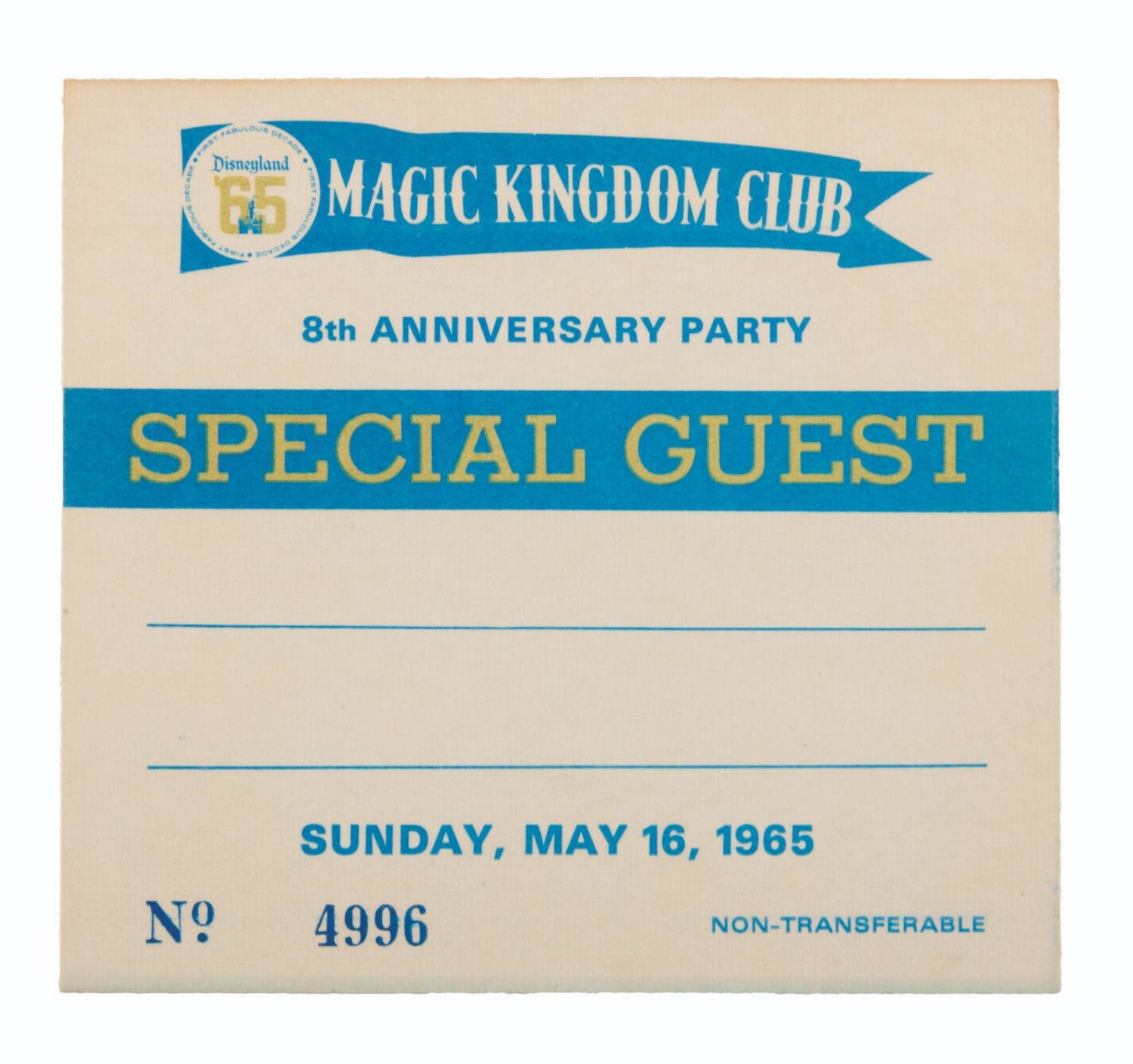 (Disneyland, 1965) An unused Special Guest sticker for the Magic Kingdom Club’s 8th anniversary party, held on May 16, 1965. Measuring 4 " x 4.5 ", the sticker is numbered 4996 and is in very good condition with light ink bleed and discoloration from age.
