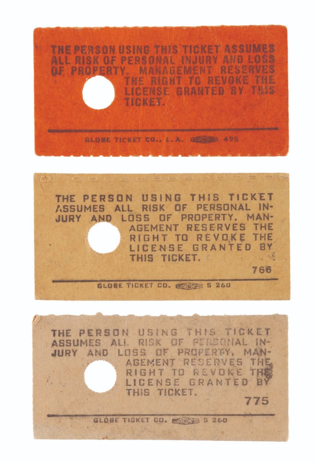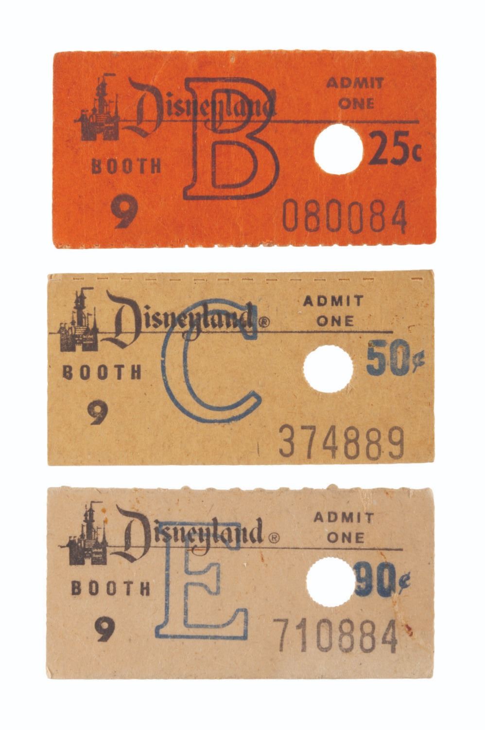 (Disneyland, 1950s-70s) Three Disneyland ticket booth tickets, including an "E " ticket, a "C " ticket, and a "B " ticket. The 90-cent "E " ticket likely dates to the 1970s, while the 25-cent "B " and 50-cent "C " may date as early as the 1950s. Each measuring 1 " x 2 ", the tickets are in very good condition with light handling wear.