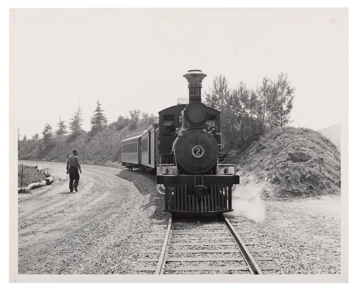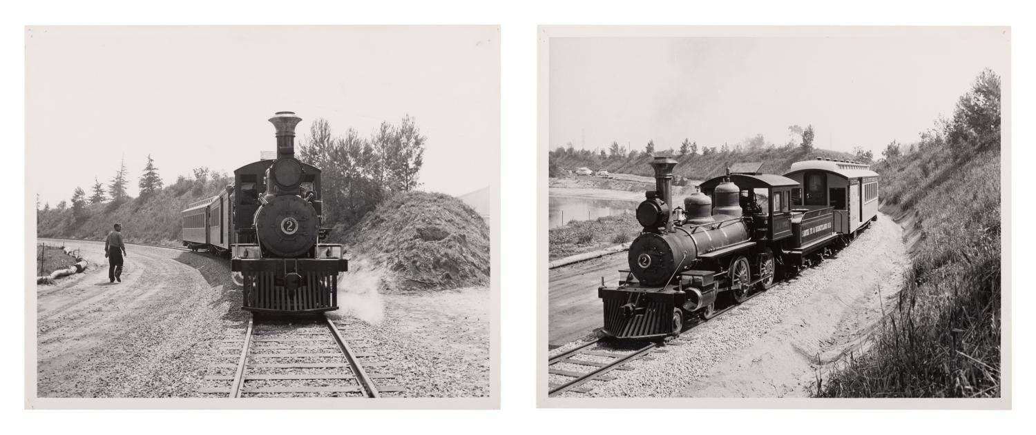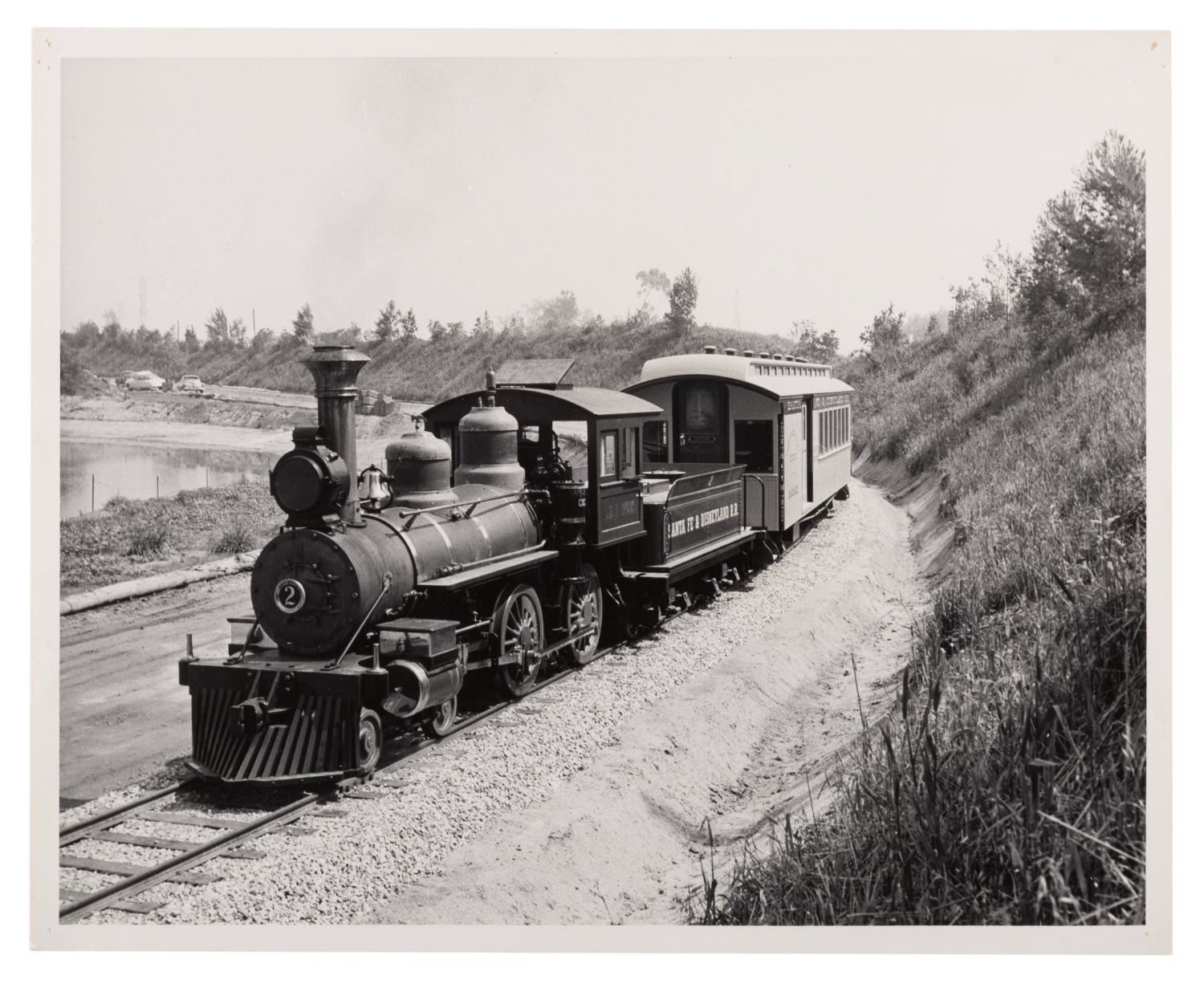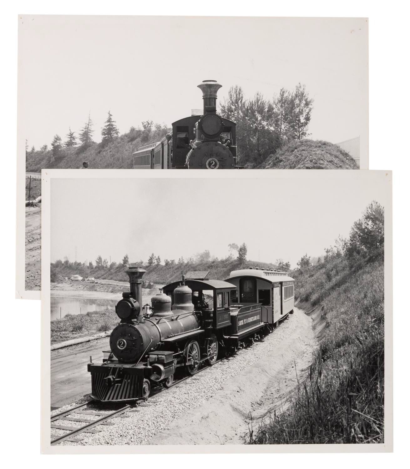 (Disneyland, 1955) Two very early photos of the Disneyland Railroad, taken before the locomotive got its distinctive new paint job for the Park. Each measuring 8 " x 10 ", the photos are in very good condition with light edge wear and pinholes at the corners.