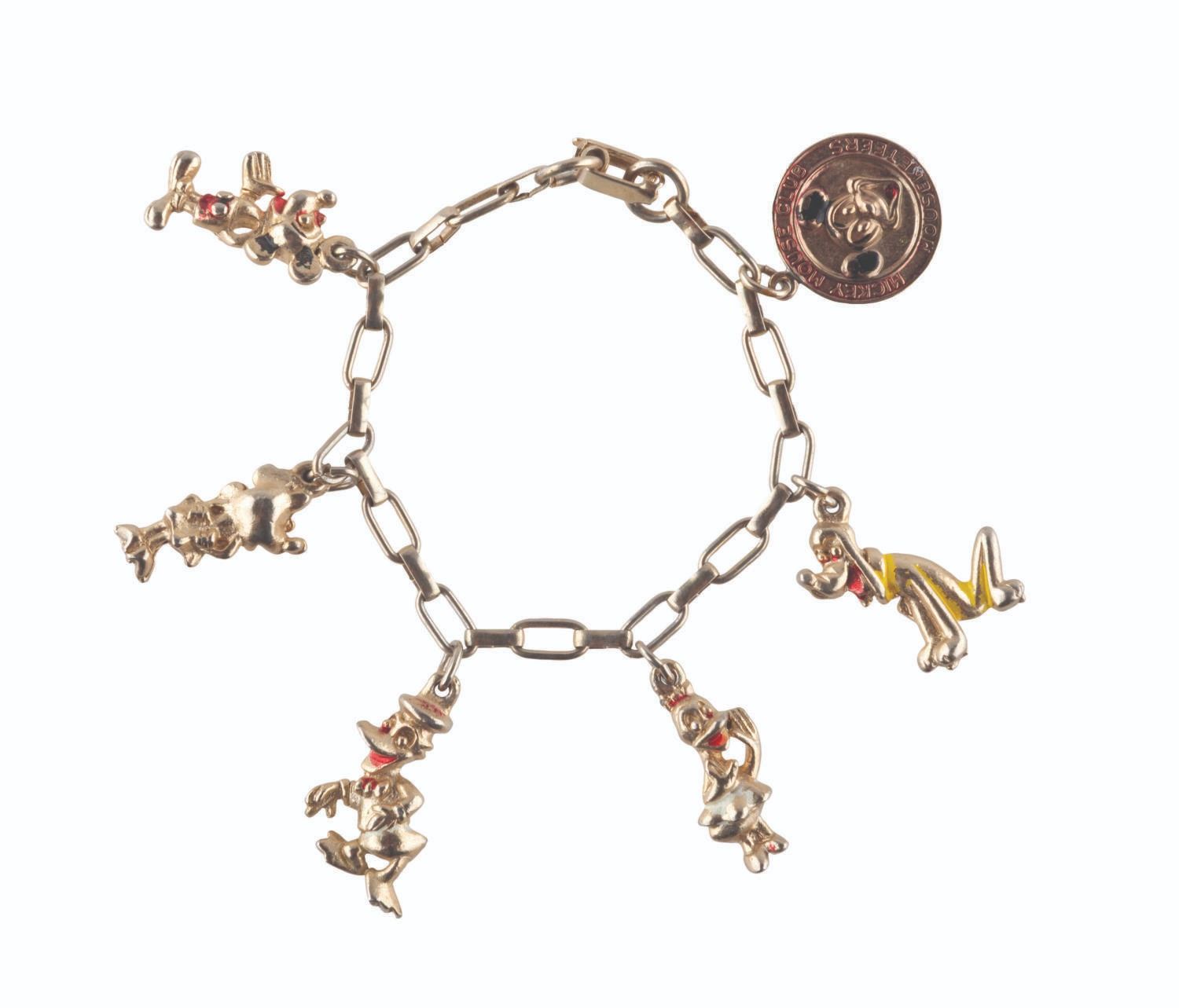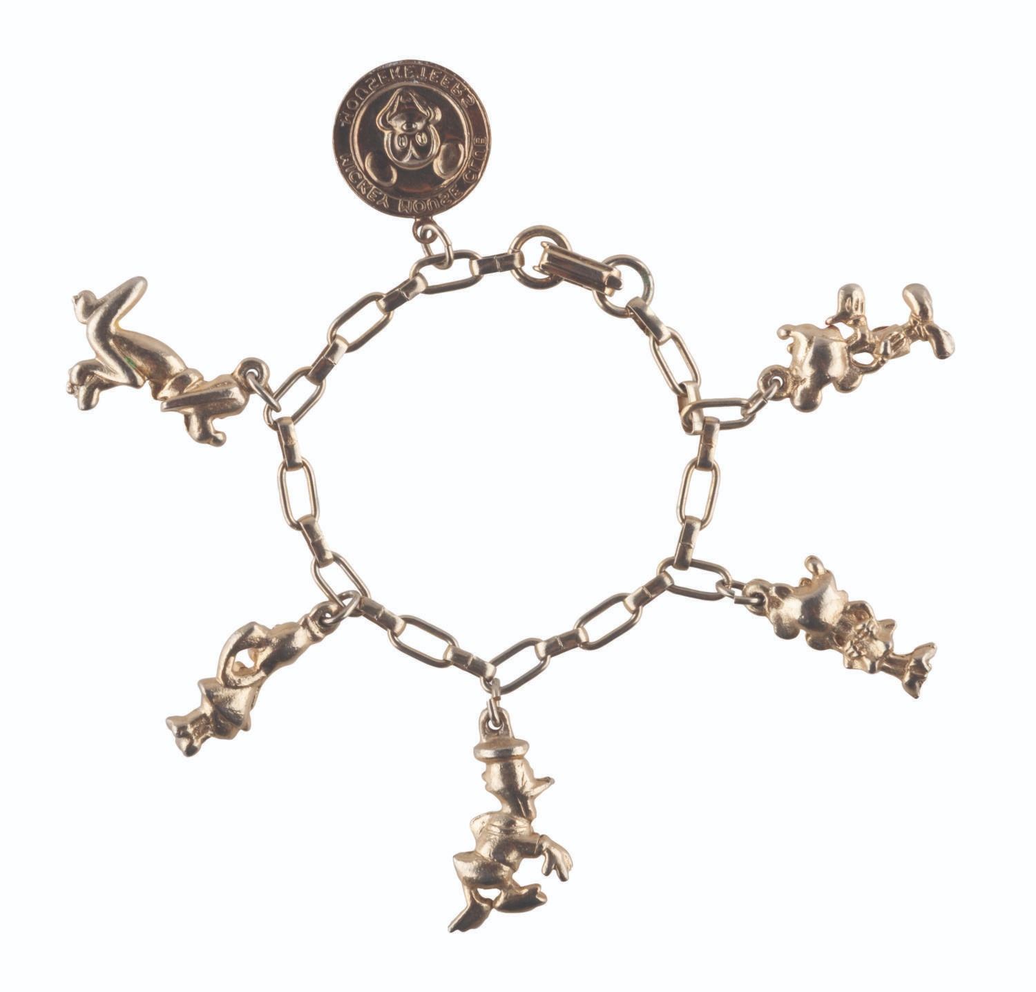 (Disneyland, 1960s) A six-piece metal souvenir charm bracelet featuring a Mickey Mouse Club Mouseketeers charm, along with figural Mickey, Minnie, Donald, Daisy, and Pluto charms. Measuring 5.5 " long, the bracelet is in good condition, with heavy paint loss and wear from usage and age.
