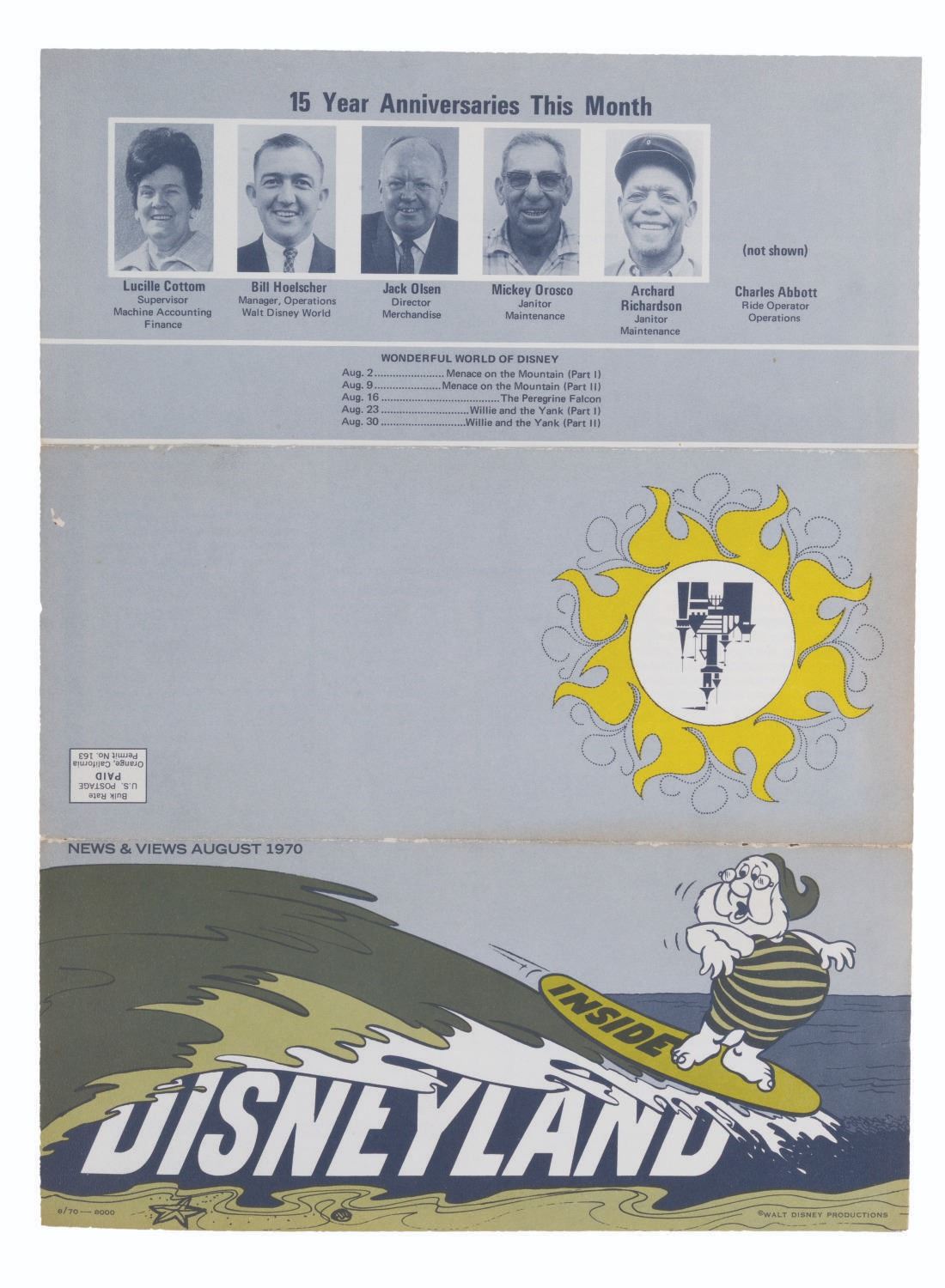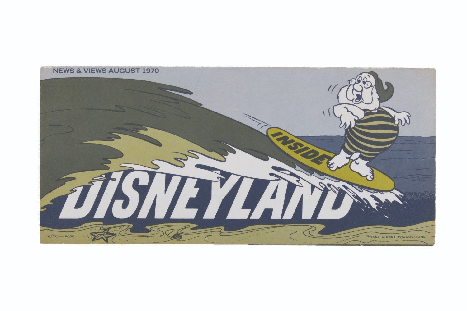 (Disneyland, 1970) An August 1970 Inside Disneyland mailer featuring Doc surfing on the cover. Measuring 4 " x 9 ", the mailer displays in very good condition with scrapes on the reverse, edge wear, and discoloration from age.