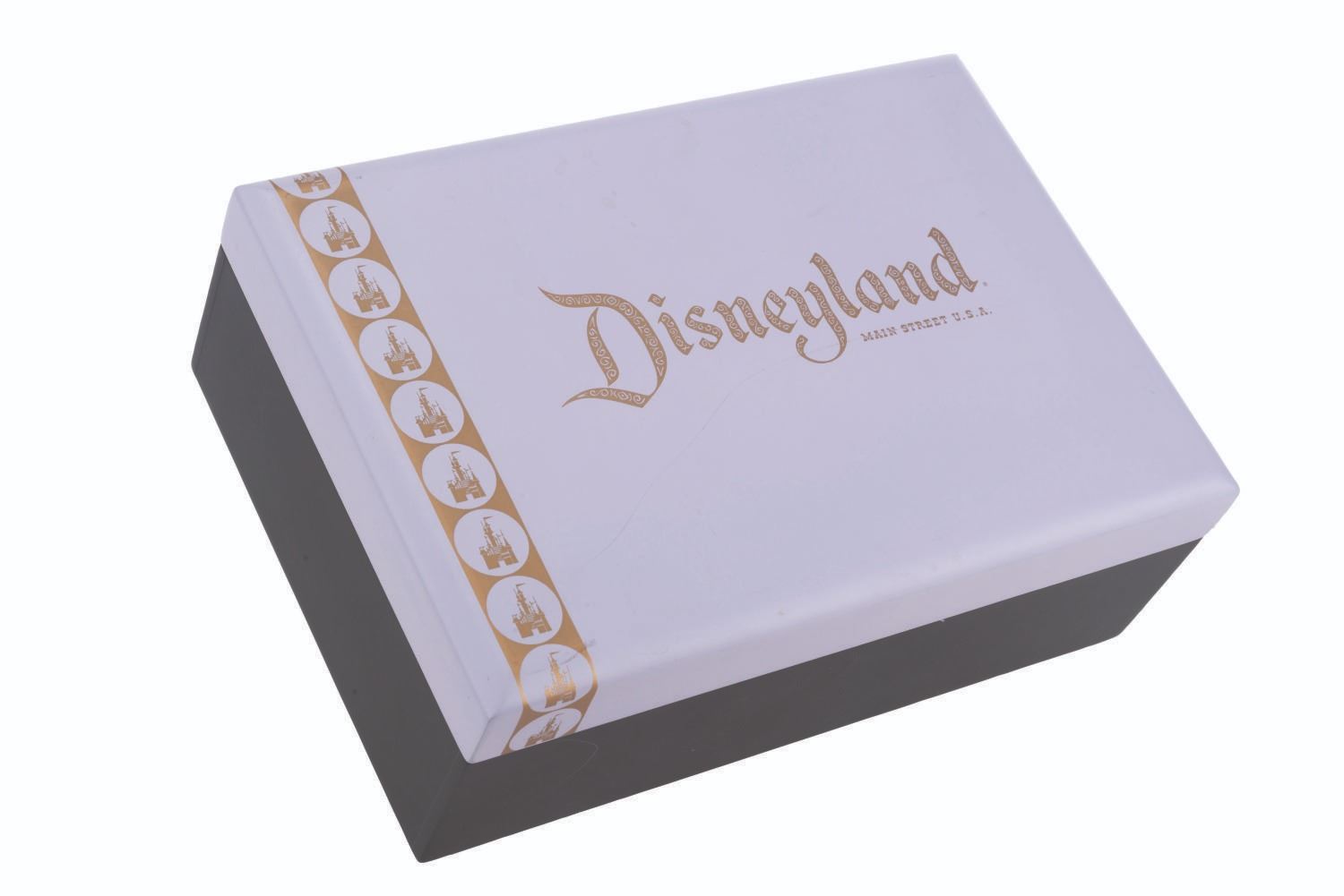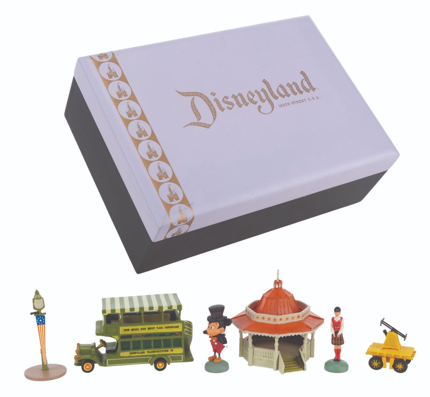 (Disneyland, 2005) A limited edition boxed set of Main Street pewter miniatures of the Omnibus, Bandstand, Lamppost, classic Mickey Mouse, a tour guide, and the railroad handcar. Created by Kevin Kidney and Jody Daily to commemorate Disneyland’s 50th Anniversary, the set was limited to 1500 pieces. The pieces standing 1.25 " to 2.25 " tall are in fine condition with a pinpoint of paint loss to the Bandstand that appears original to production, and small scuffs and scratches to the lid of the presentation box.