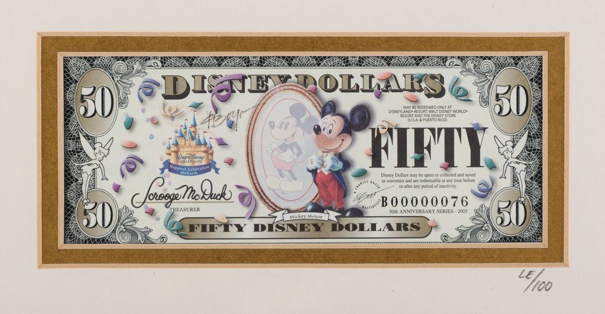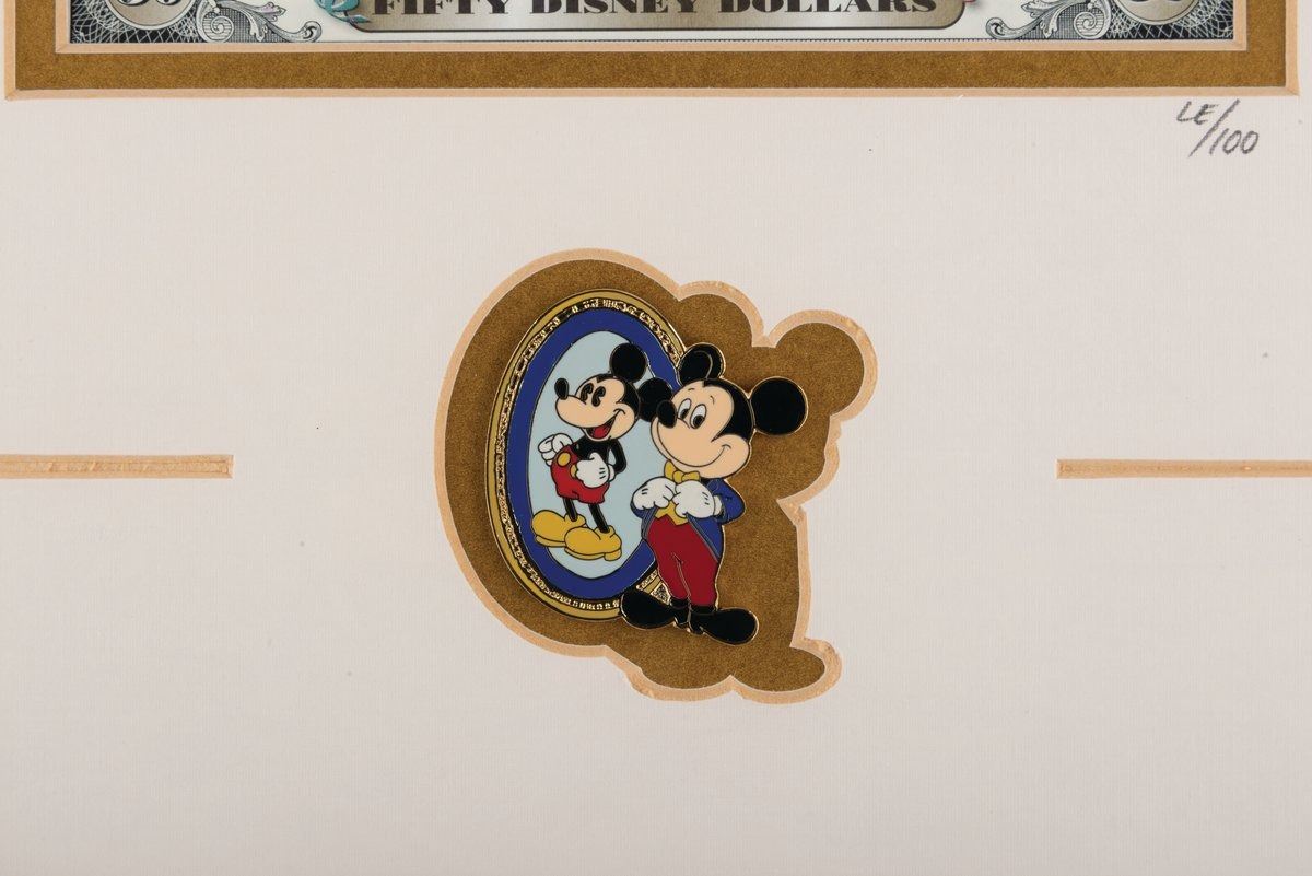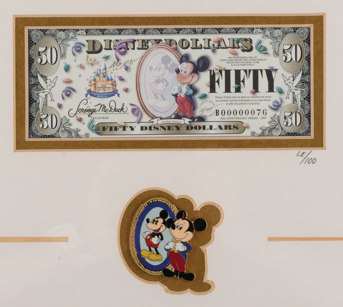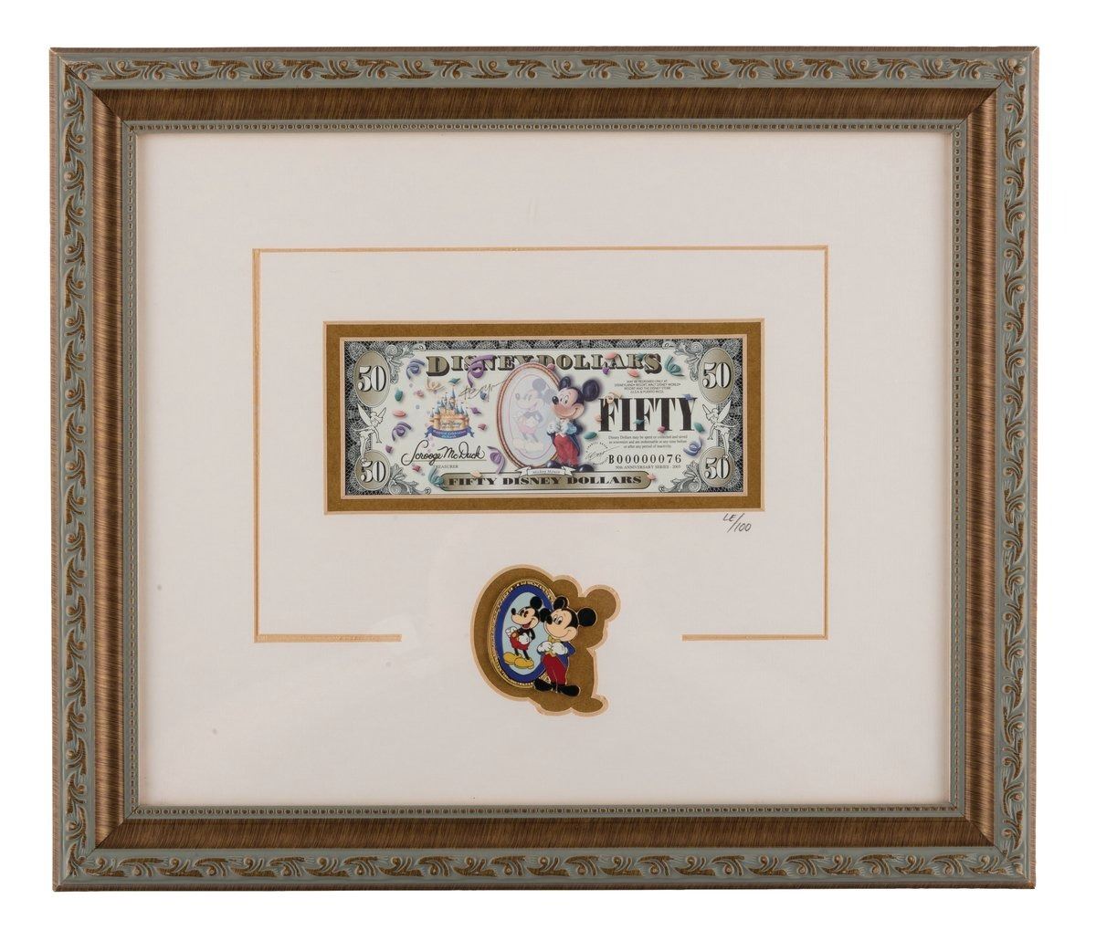 (Disney, 2005) A very rare framed $50 Disney Dollar signed by designer Charles Boyer. Released in a limited edition of only 100, this is one of the scarcest denominations of Disney Dollars and the only one we have come across in our 30 years in the business. Included in the display is a pin matching the art featured on the bill. Housed in a 12.75 " x 14.75 " framed matte, the Disney Dollar and frame are in fine condition, while the frame displays in very good condition with surface scratches and light wear.