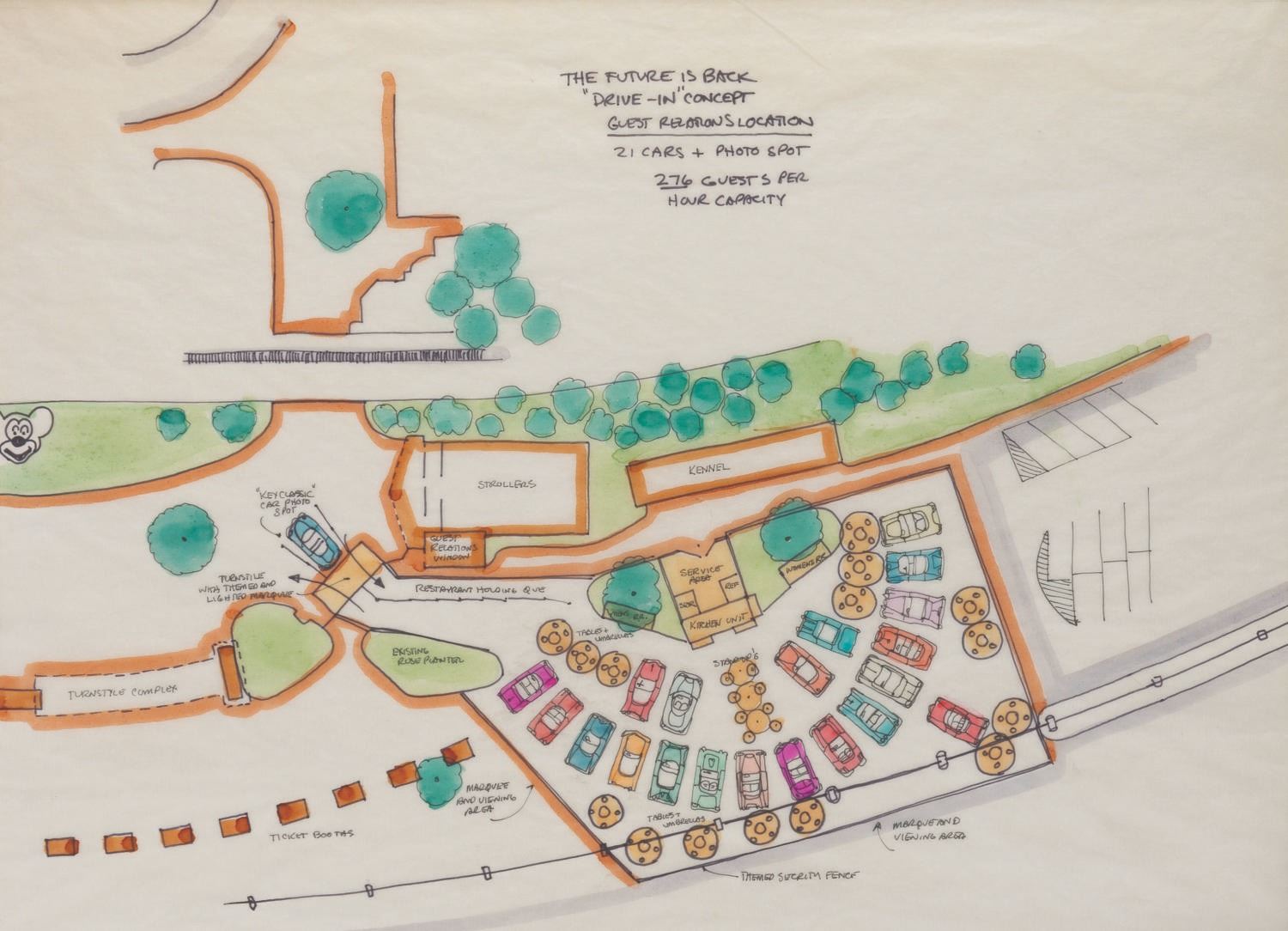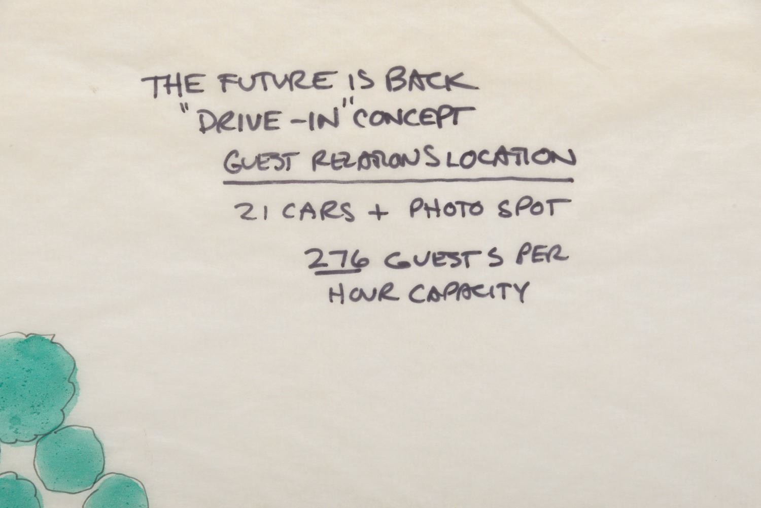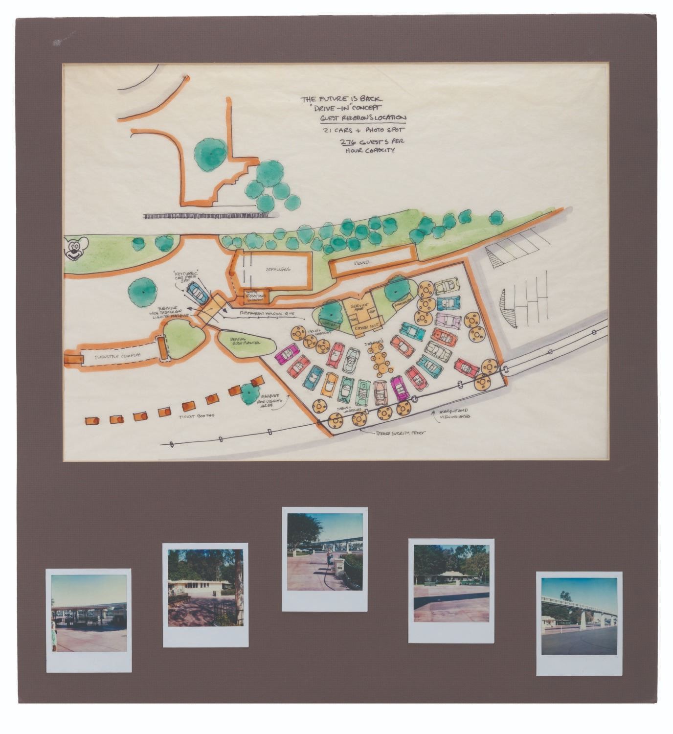(Disneyland, 1990s) A Walt Disney Imagineering pitch board for an unrealized 1950s-style drive-in restaurant that would have been situated just east of the Disneyland Main Gate. The board features an original drawing in ink and watercolor on vellum, illustrating a bird's-eye view of the restaurant, designed with booths styled as classic cars. Below the drawing, a set of five Polaroid photos depicts the proposed location. The drawing measures 16.25 " x 22 " visible through the 28 " x 26 " matte board. Each Polaroid measures 4.25 " x 3.5 ". The piece is in very good condition with some edge and corner wear and handling.