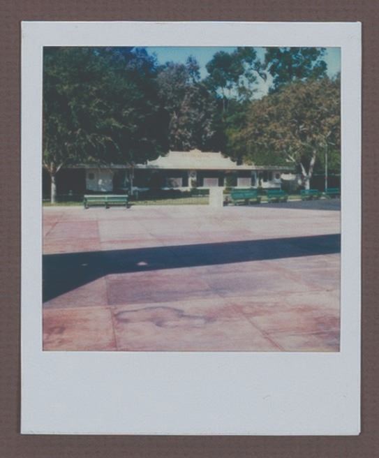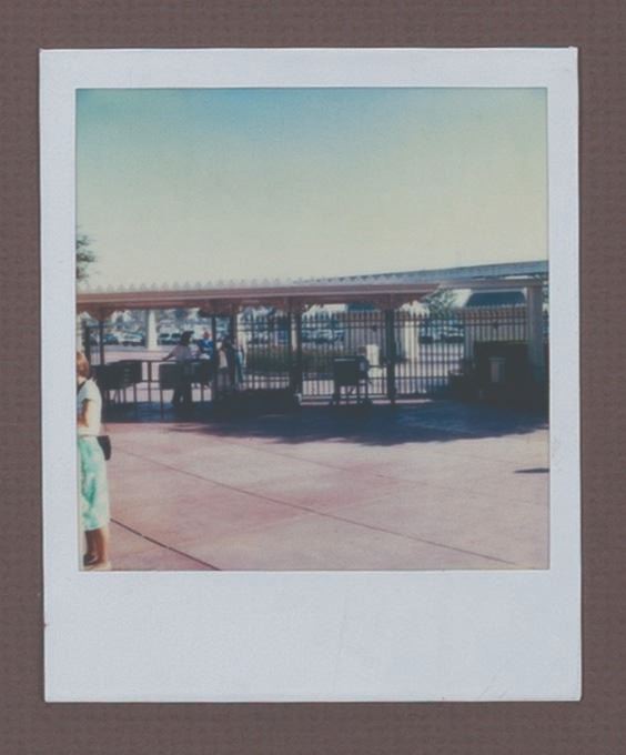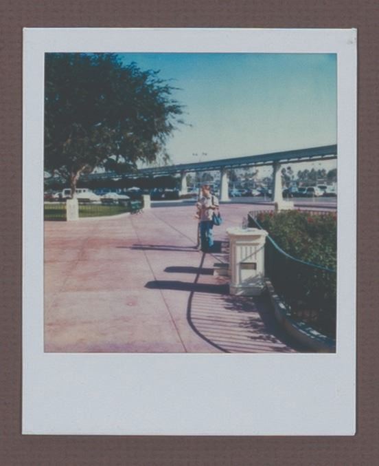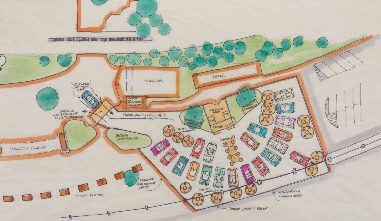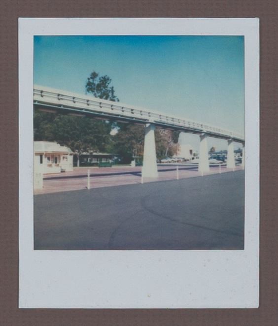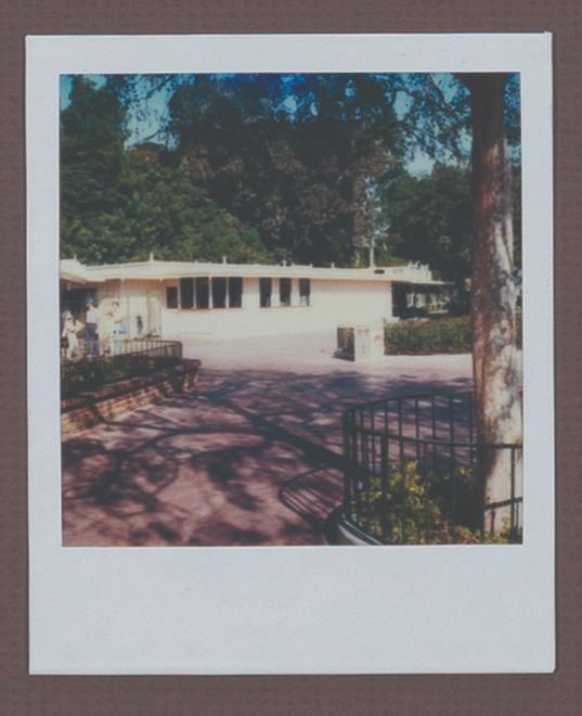 (Disneyland, 1990s) A Walt Disney Imagineering pitch board for an unrealized 1950s-style drive-in restaurant that would have been situated just east of the Disneyland Main Gate. The board features an original drawing in ink and watercolor on vellum, illustrating a bird's-eye view of the restaurant, designed with booths styled as classic cars. Below the drawing, a set of five Polaroid photos depicts the proposed location. The drawing measures 16.25 " x 22 " visible through the 28 " x 26 " matte board. Each Polaroid measures 4.25 " x 3.5 ". The piece is in very good condition with some edge and corner wear and handling.