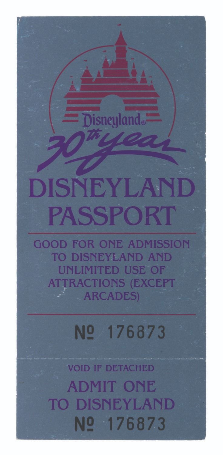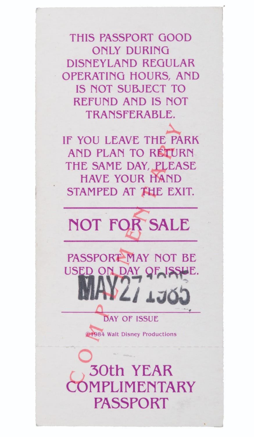 (Disneyland, 1985) A Disneyland 30th anniversary complimentary passport, numbered 176873. Measuring 2.25 " x 5 ", the ticket is in good condition with scratches, wear, and stamps on the reverse that read "Complimentary " and "May 27, 1985. "