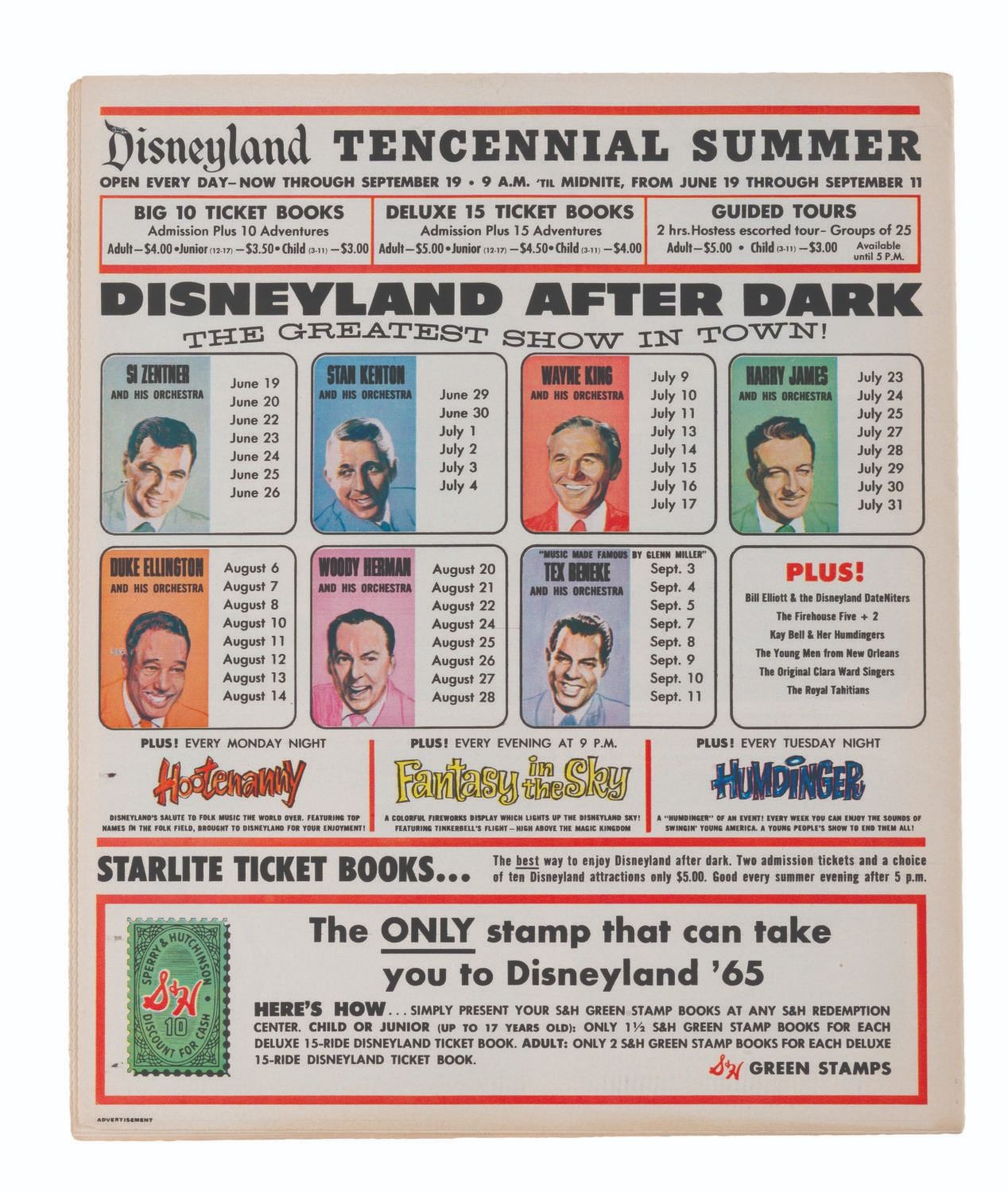 (Disneyland, 1965) A newspaper supplement from the Oakland Tribune commemorating Disneyland's 10th anniversary with a history of the Park and full-color photos. Measuring 10.75 " x 13 ", the 20-page supplement displays in very good condition with creases, staple holes, handling wear, and discoloration from age.
