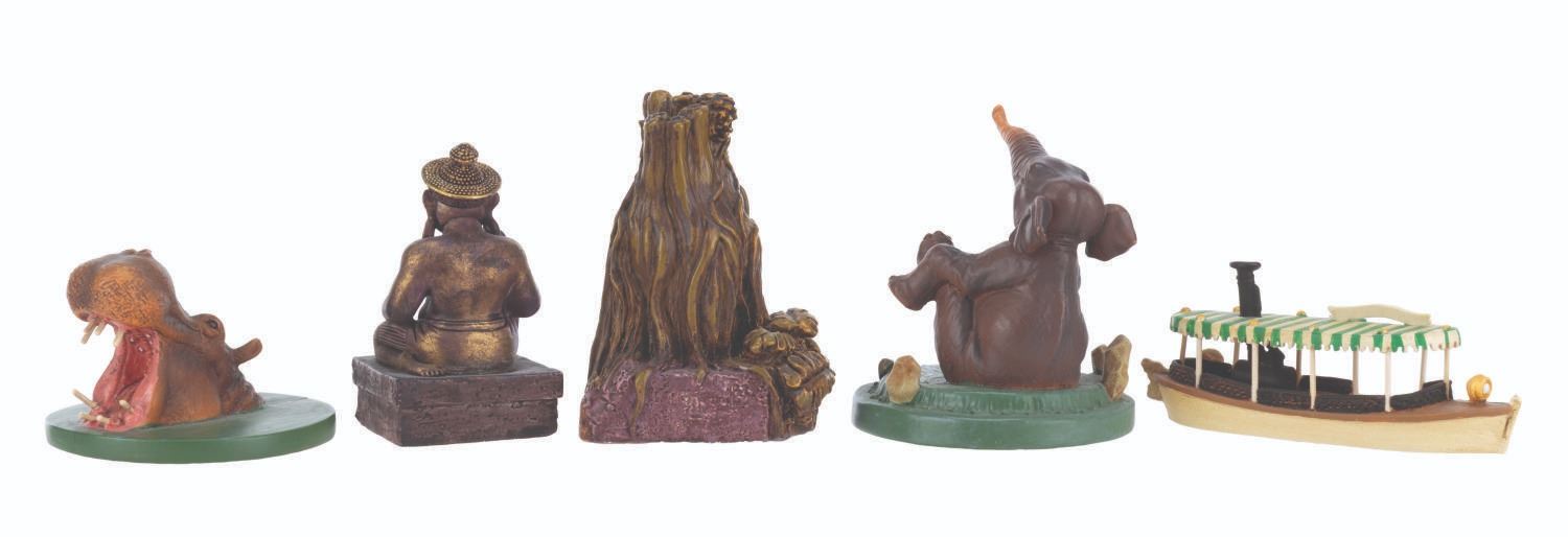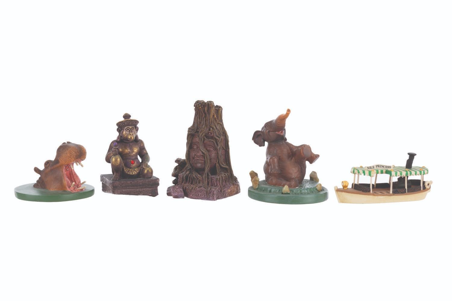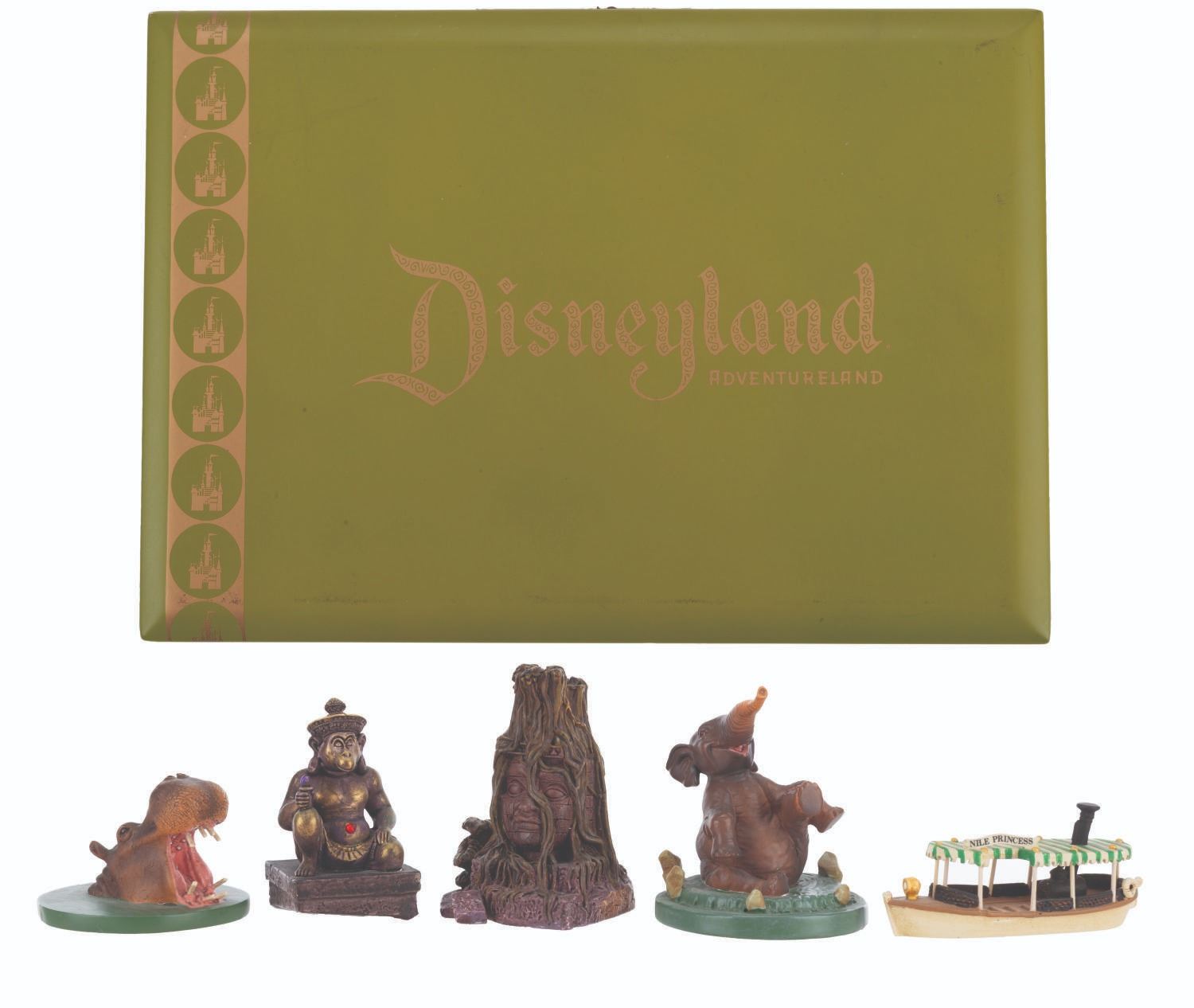 (Disneyland, 2005) A partial set of Adventureland miniatures designed by Kevin Kidney and Jody Daily. Released for the 50th anniversary of Disneyland in an edition of 1500, the pewter miniatures include the Jungle Cruise Nile Princess boat, a tree deity, Monkey Shrine, Elephant, and a Hippo. This incomplete set is missing the Adventureland Entrance. Standing from 1.25 " to 2.25 " tall, the miniatures are in very good condition with small spots of paint loss near the base of the tree deity and Monkey Shrine, and small scuffs to the presentation box.