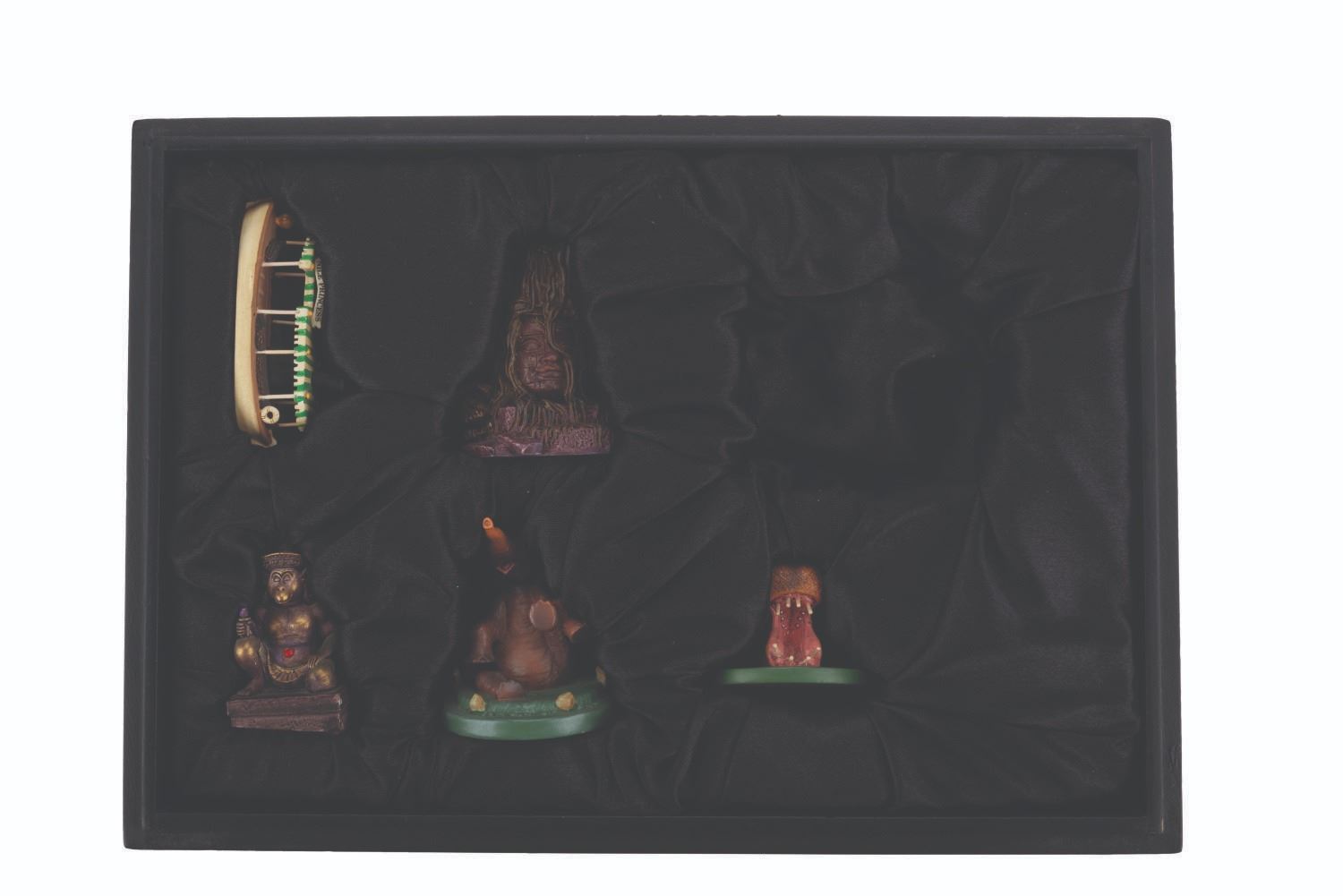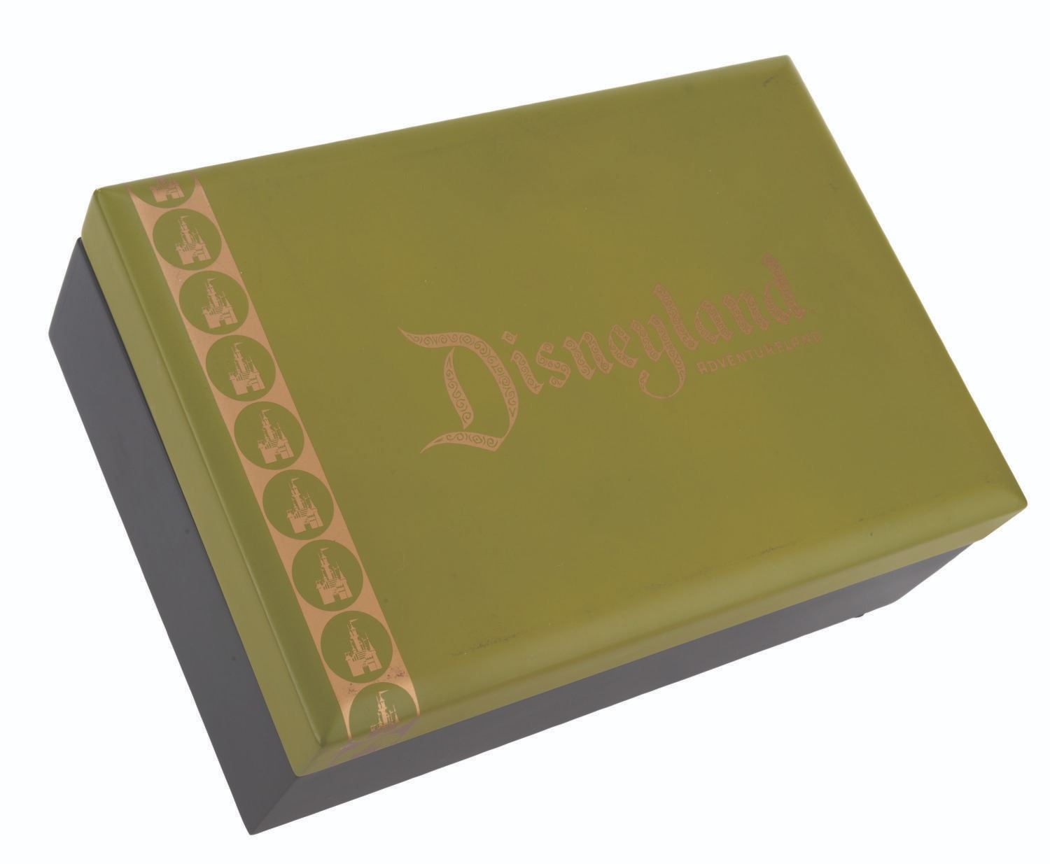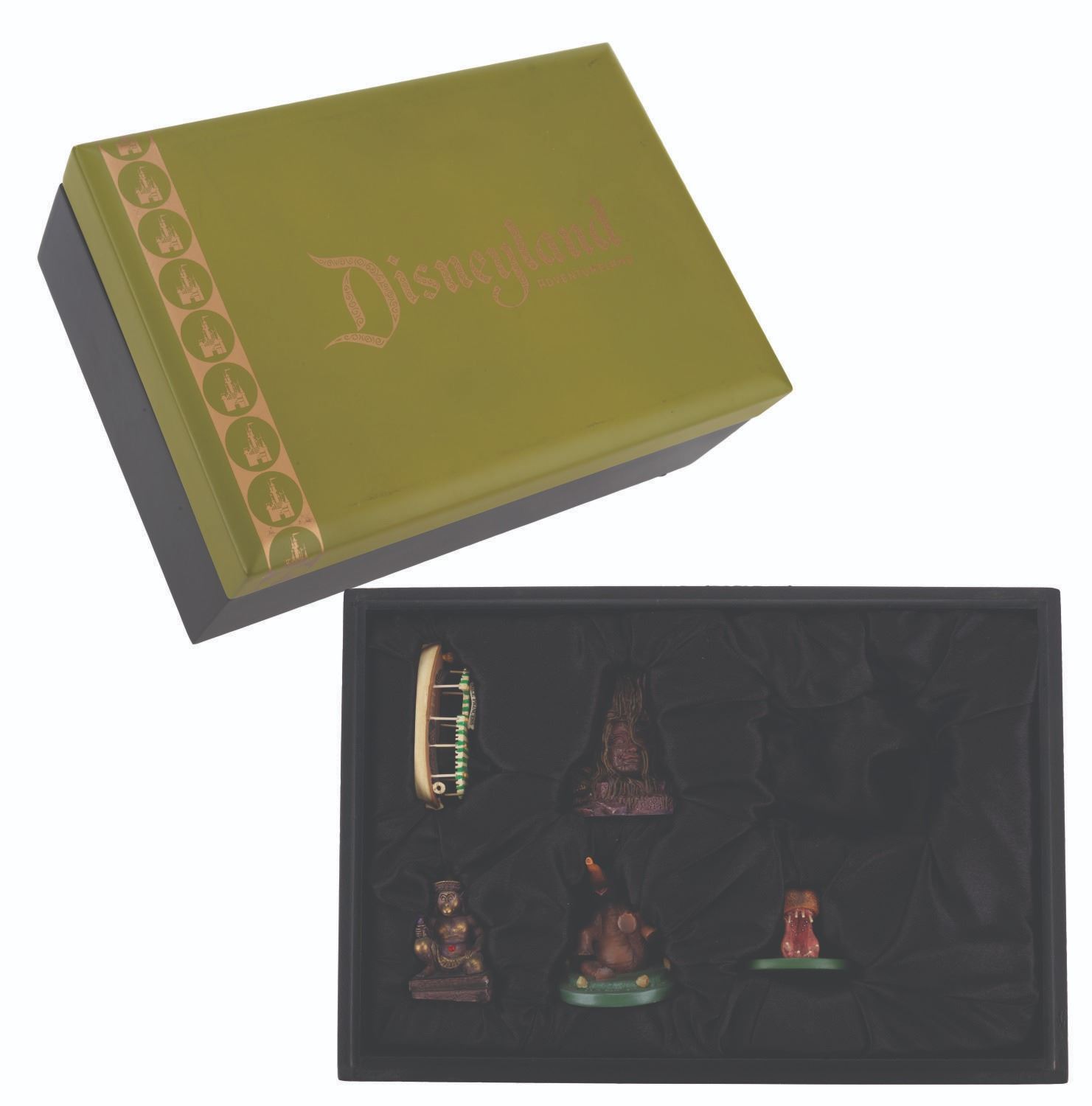 (Disneyland, 2005) A partial set of Adventureland miniatures designed by Kevin Kidney and Jody Daily. Released for the 50th anniversary of Disneyland in an edition of 1500, the pewter miniatures include the Jungle Cruise Nile Princess boat, a tree deity, Monkey Shrine, Elephant, and a Hippo. This incomplete set is missing the Adventureland Entrance. Standing from 1.25 " to 2.25 " tall, the miniatures are in very good condition with small spots of paint loss near the base of the tree deity and Monkey Shrine, and small scuffs to the presentation box.