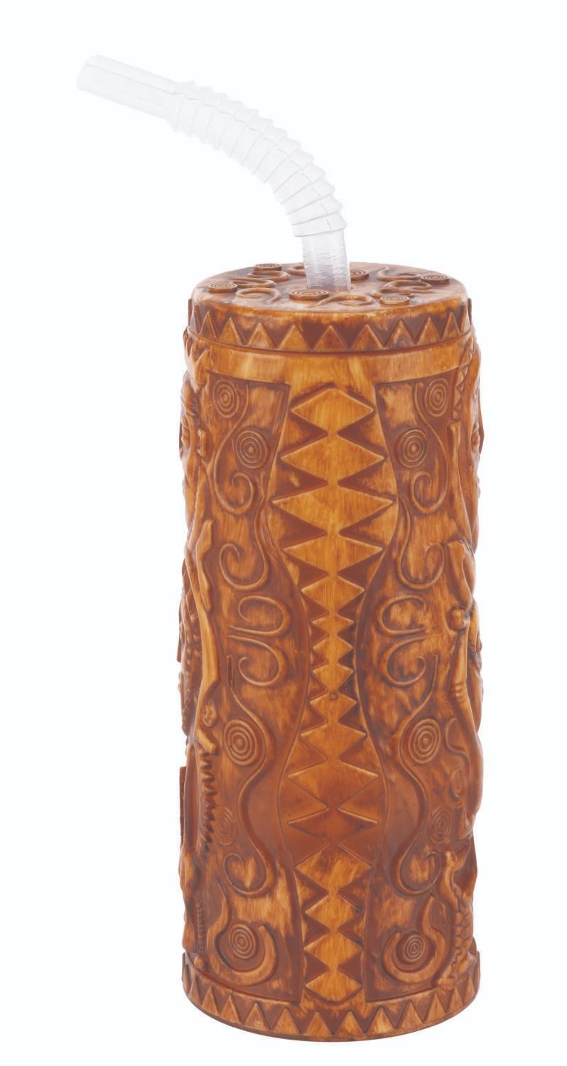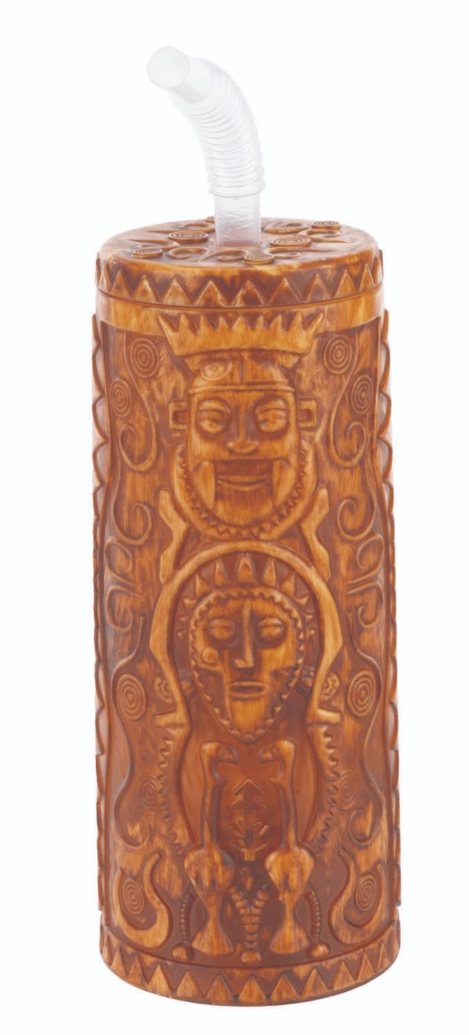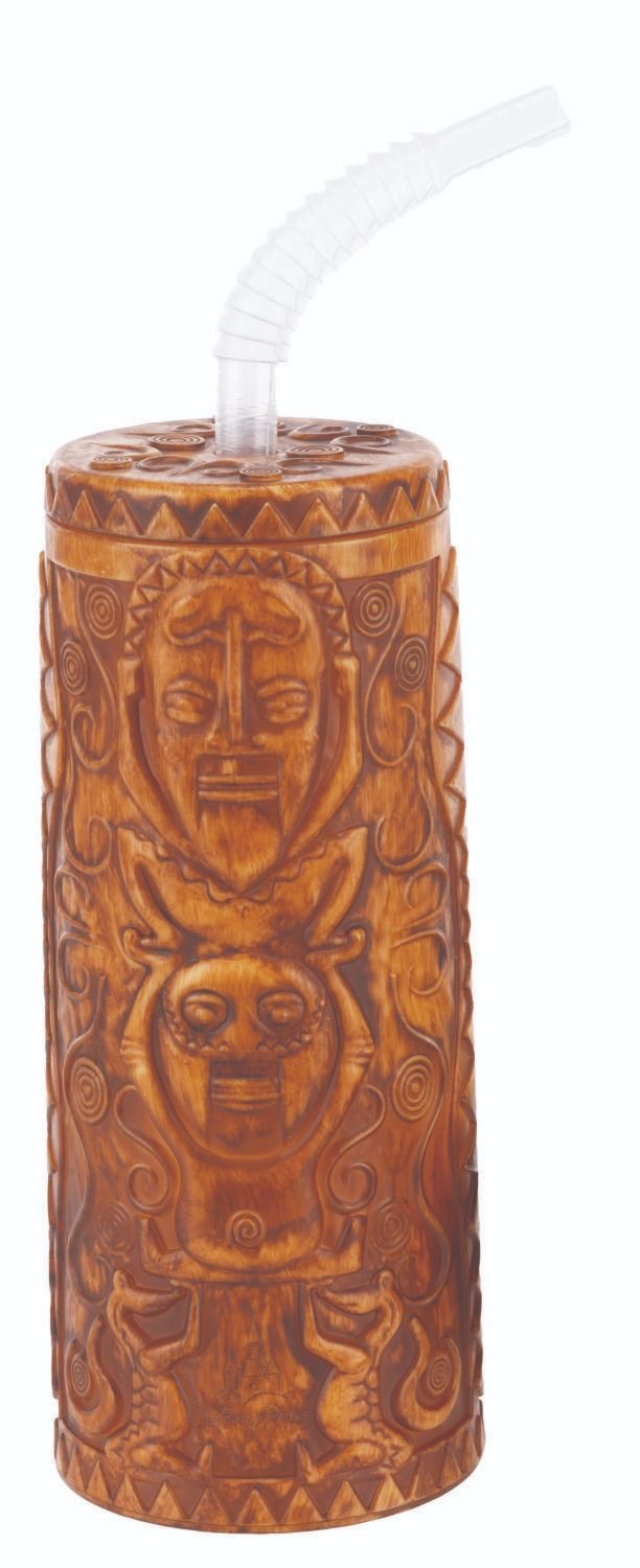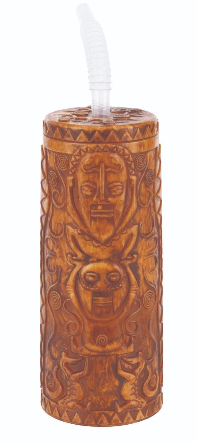(Disney Parks, 2010s-20s) A souvenir plastic tiki bowl and sipper with a straw, based on Walt Disney's Enchanted Tiki Room. Ranging in size from 4.75 " in diameter and 2.5 " tall to 2.75 " in diameter and 10 " tall, including the straw, the plastic items display in very good condition with light scratches and wear.