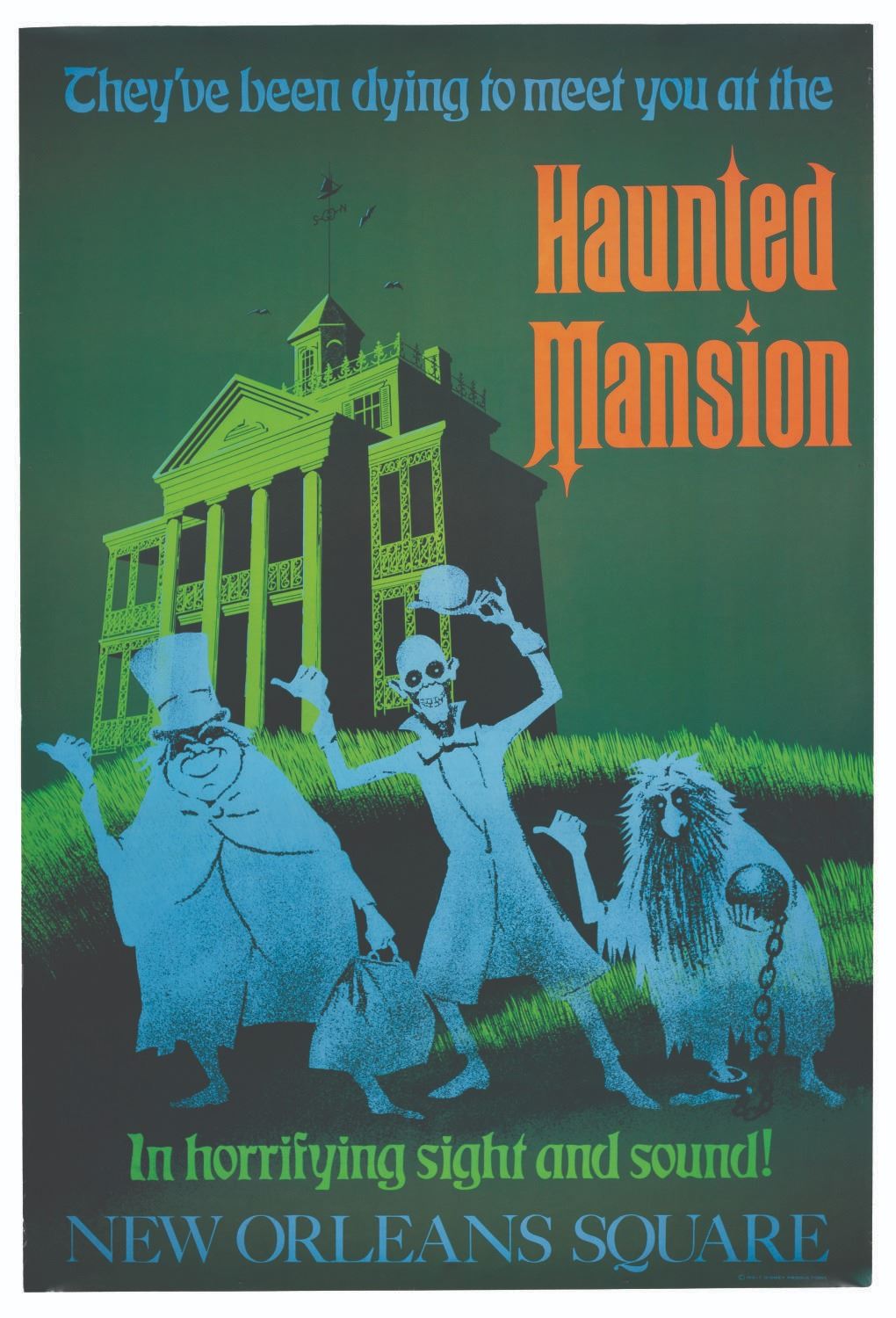 (Disneyland, 1990s) A printed reproduction Haunted Mansion attraction poster from the Disney Gallery. For a very short period, Disneyland offered these full-size reproductions of the Park's iconic attraction posters at the Disney Gallery. These posters are incredibly sought-after by fans. Measuring 36 " x 54 ", the poster is in very good condition with very light creasing and minimal edge wear mainly along the left edge.