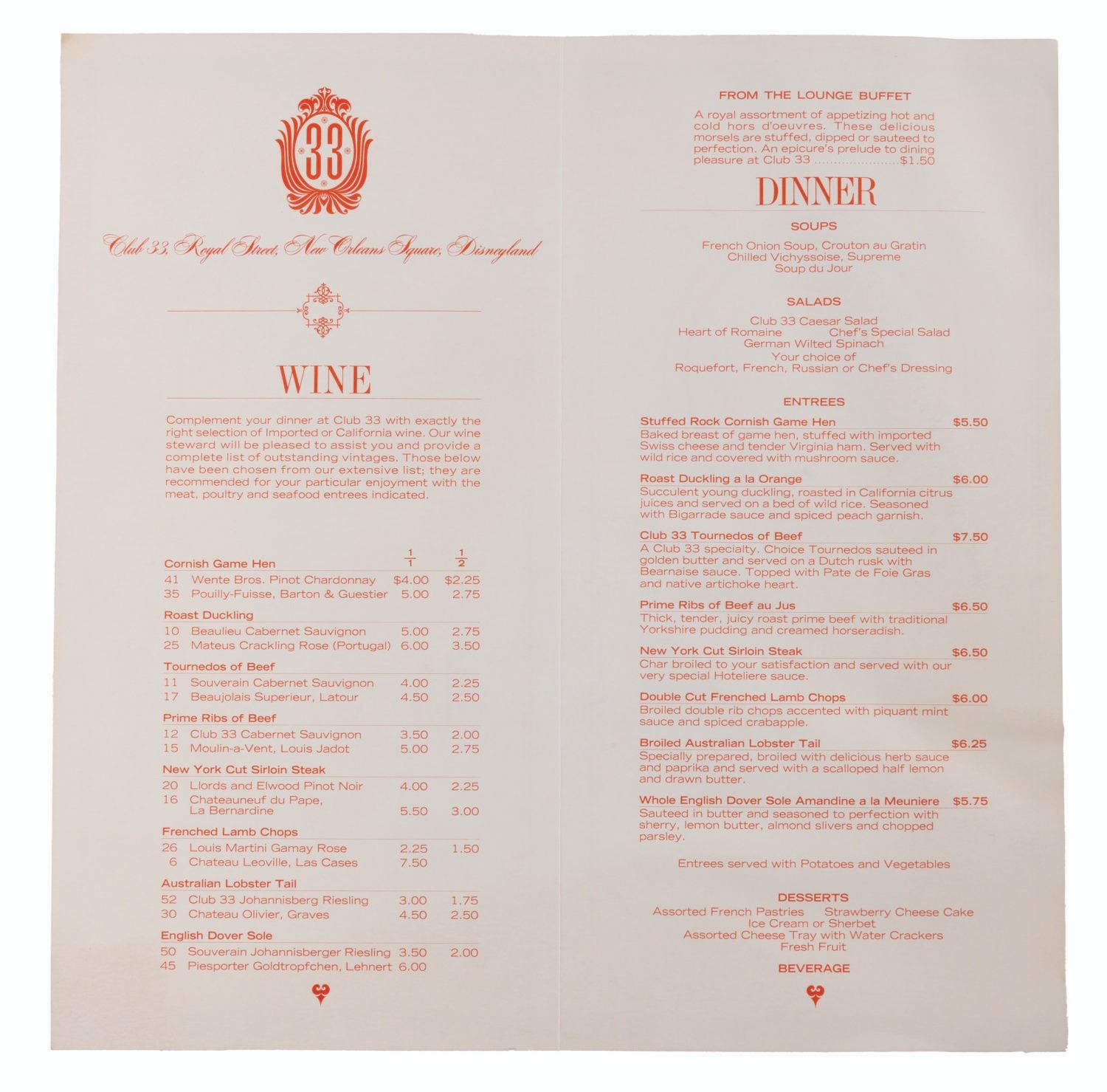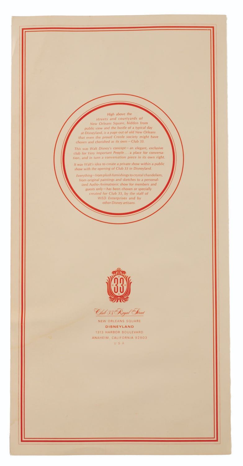 (Disneyland, 1967) An early dinner menu from Club 33, the members-only establishment in New Orleans Square. Club 33 was one of the last Disneyland projects Walt oversaw and contributed to, opening just five months after his passing in December of 1966. Walt envisioned an interactive animatronic experience in the Club's Trophy Room, in which characters conversed with Guests using hidden microphones and an operator behind the scenes. Although this never came to be due to concerns over Guest privacy, the cover of this menu refers to this show, making this likely the very first menu for the venue, only used for a very short time or replaced before opening. Measuring 16 " x 16 " unfolded, the menu is in good condition with a faint stain on the back cover, waviness, minor creases, and edge wear.