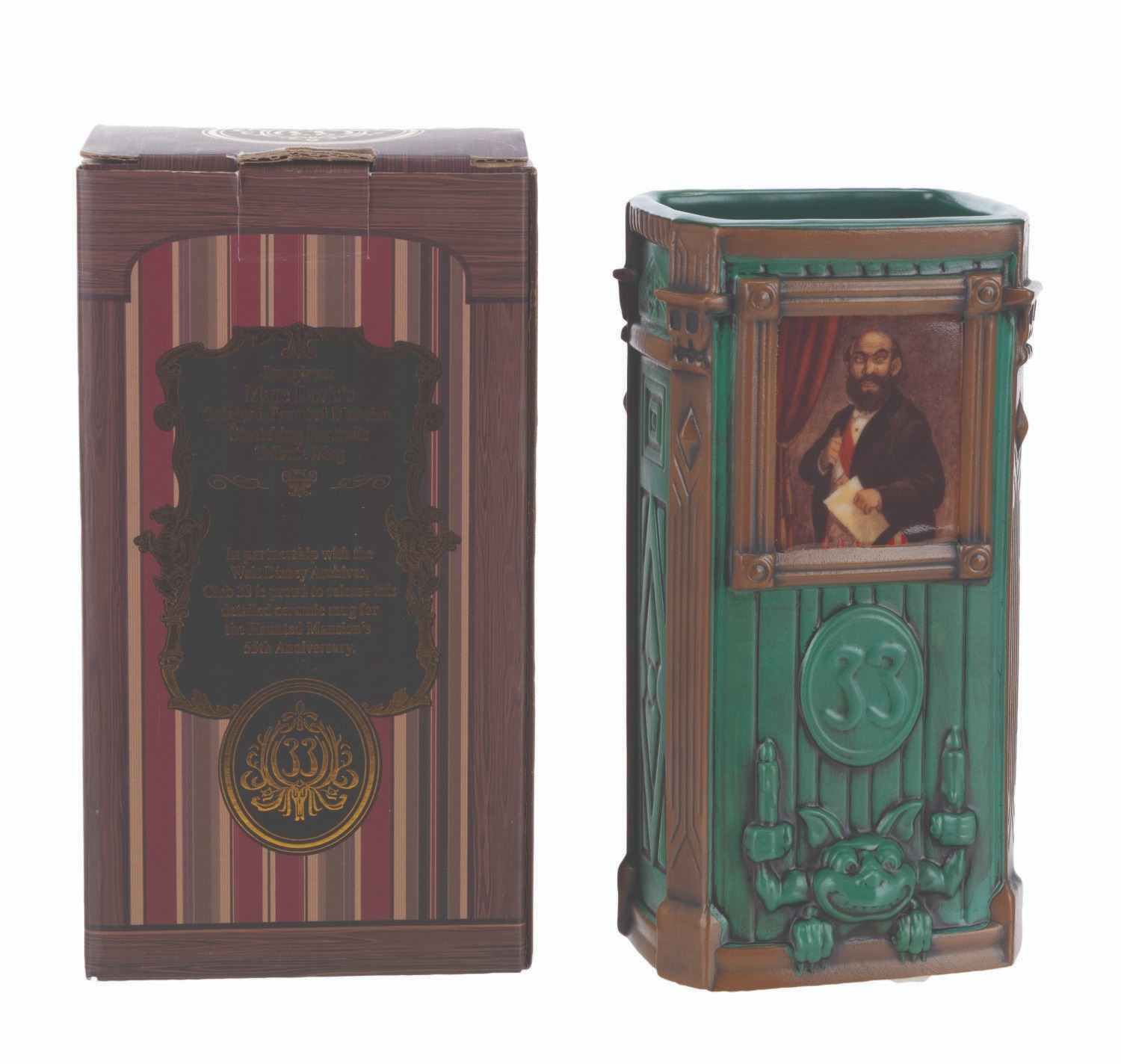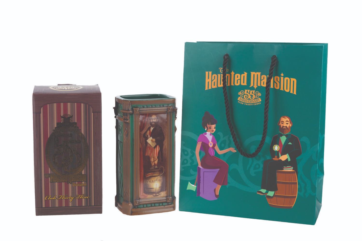 (Disneyland, 2024) A tiki mug and souvenir bag from the Club 33 Haunted Mansion 55th anniversary event. Based on Marc Davis’ original stretching portrait art, this mug features the Dynamite Man. The mug measures 3.5 " x 2.75 " x 6.75 " with the original 4 " x 3.5 " x 7.25 " tall box and 4 " x 8 " x 10 " bag, all in fine condition with a slight scuff to the top of the box.