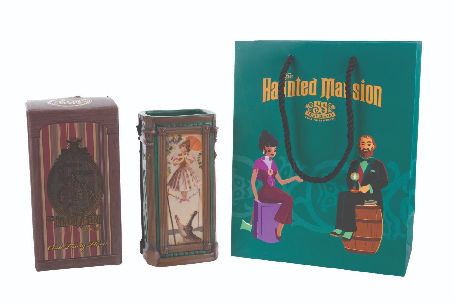 (Disneyland, 2024) A tiki mug and souvenir bag from the Club 33 Haunted Mansion 55th anniversary event. Based on Marc Davis’ original stretching portrait art, this mug features the tightrope walker. The mug measures 3.5 " x 2.75 " x 6.75 " with the original 4 " x 3.5 " x 7.25 " tall box and 4 " x 8 " x 10 " bag, all in fine condition.