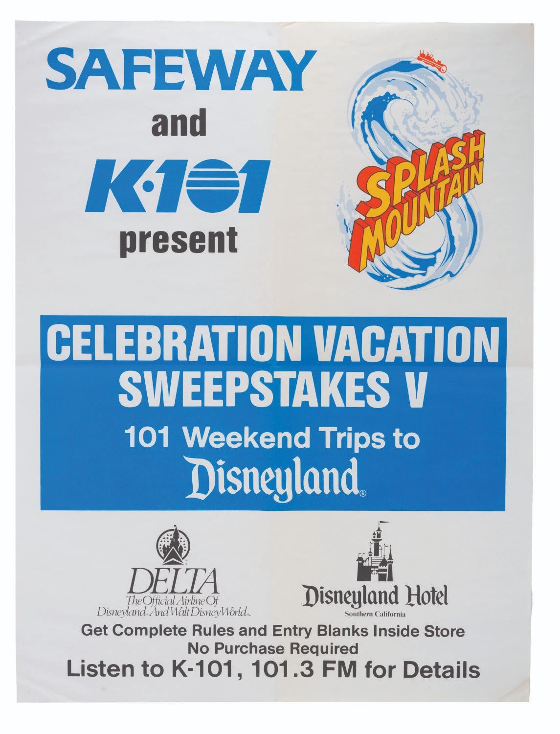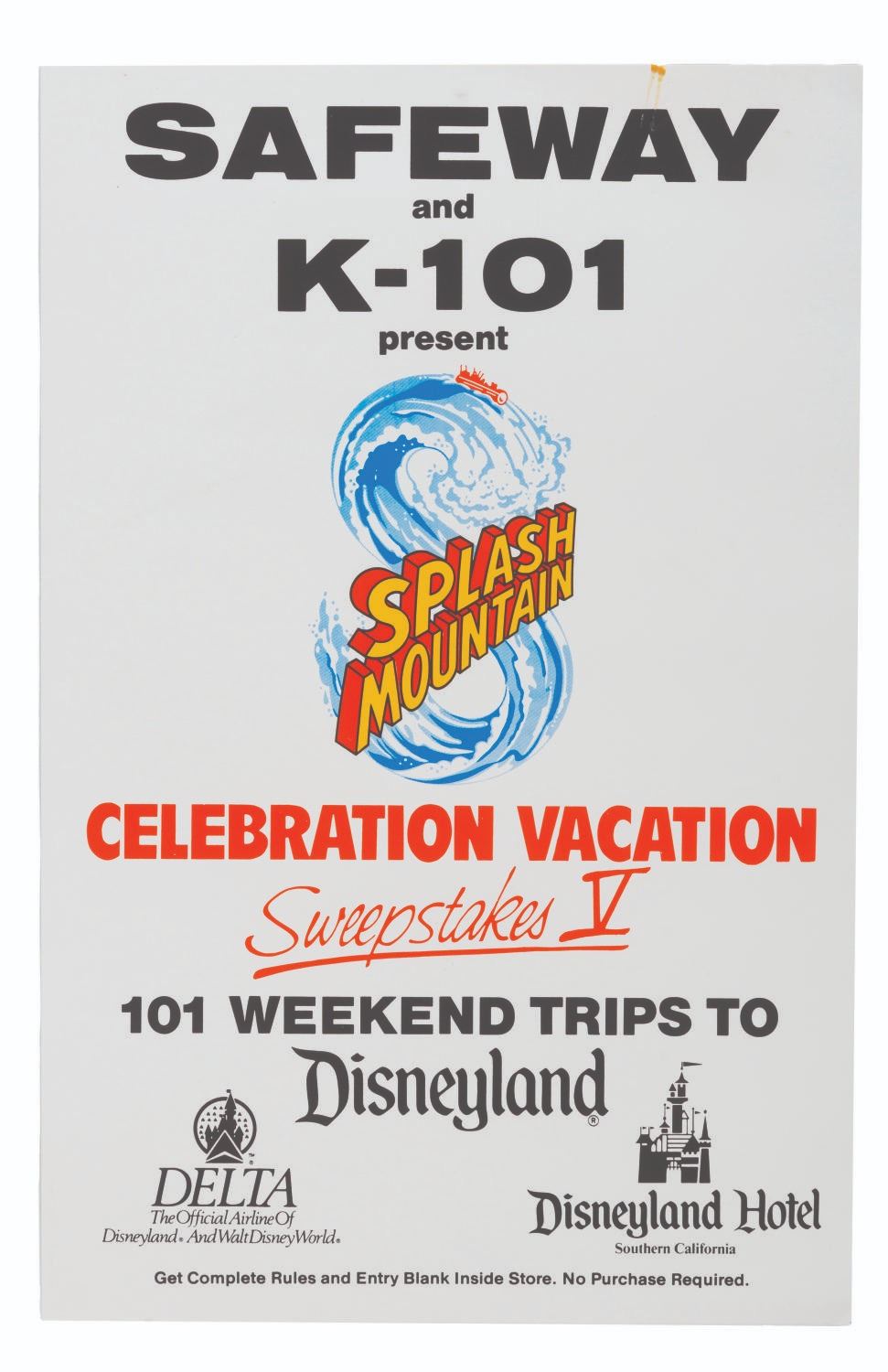 (Disneyland, 1989) A Splash Mountain Disneyland Celebration Vacation Sweepstakes V display. Presented by K-101, Safeway, and Delta, the sweepstakes awarded 101 weekend trips to Disneyland. Included in the display kit are a large 28 " x 38 " hanging mobile frame with a rotating Splash Mountain disk and hanging hardware, a huge 38 " x 50 " poster, and two smaller 13 " x 20 " posters. The display is in good condition with staining spots in the corners of the posters and light creases, scuffs, and edge wear throughout.