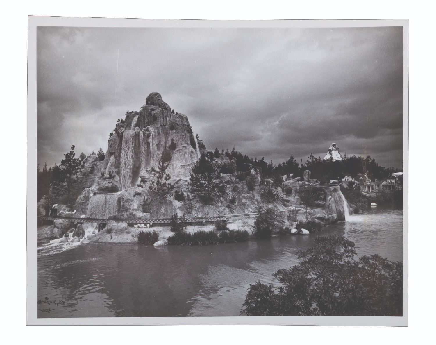 (Disneyland, 1960s-80s) A black and white photo of Cascade Peak on Disneyland’s Rivers of America, featured in the Mine Train Through Nature's Wonderland attraction. Measuring 8 " x 10 ", the photo is in good condition with scratches, stains, and wear.