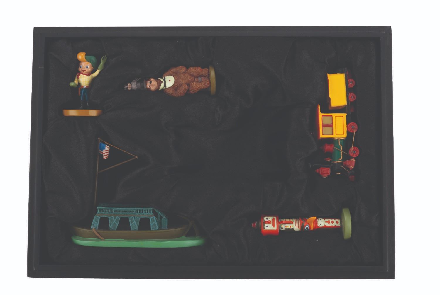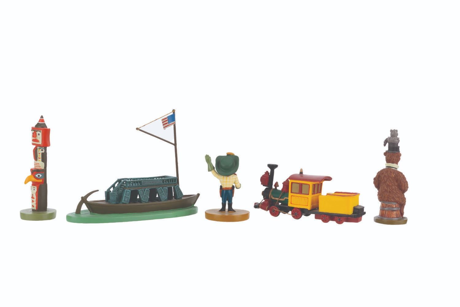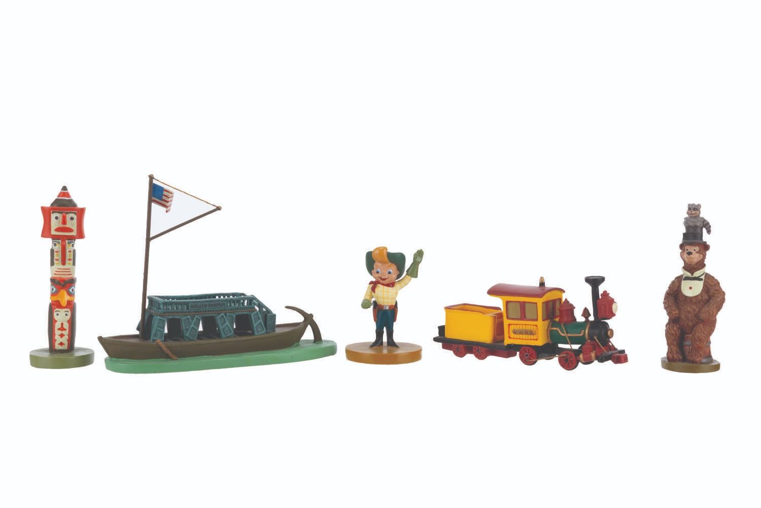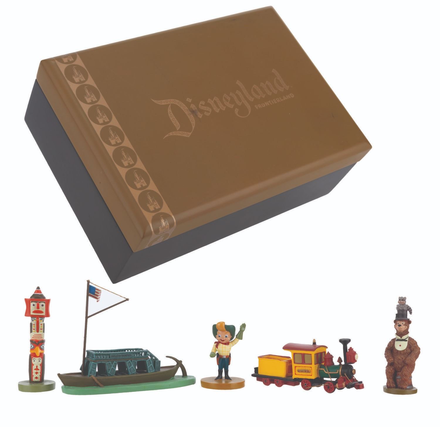 (Disneyland, 2005) A partial set of Frontierland miniatures designed by Kevin Kidney and Jody Daily. Released for the 50th anniversary of Disneyland in an edition of 1500, the pewter miniatures include the Nature's Wonderland Mine Train, the Frito Kid, Country Bear Henry, an Indian Village totem pole, and the Gullywhumper Keel Boat. This incomplete set is missing the Frontierland Stockade entrance. The figurines range in size from 1.75 " to 3 " tall and are in fine condition, with light handling wear and a scuff to the presentation box.