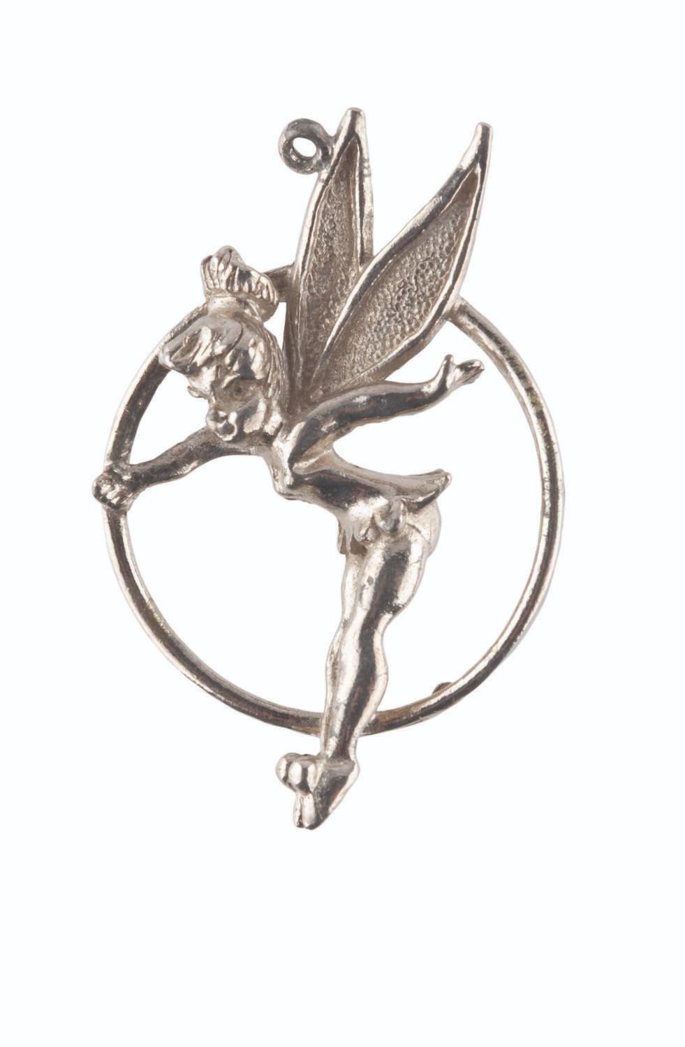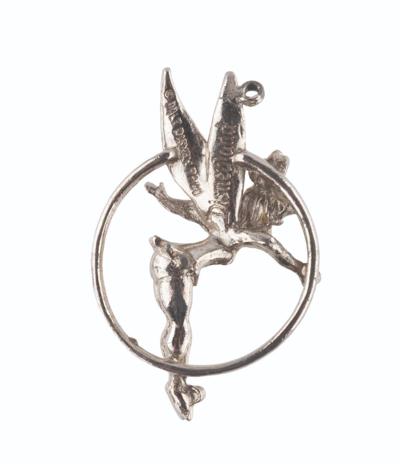 (Disneyland, 1950s) A large silver-colored metal charm of Tinker Bell with "Disneyland " on the back. Measuring 2 " x 1.25 ", the charm is in very good condition with light wear from handling.