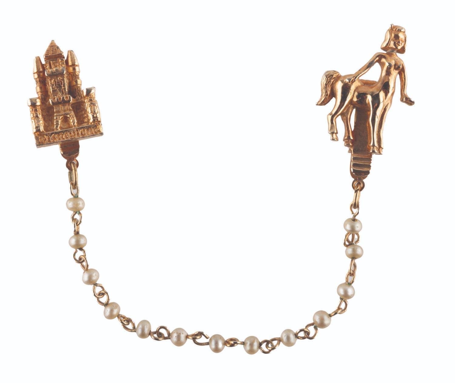 (Disneyland, 1950s-60s) A gold-toned souvenir sweater guard from Disneyland featuring faux pearls and charms of Sleeping Beauty Castle and a Centaurette from "Fantasia. " Measuring 6.75 " long, the sweater guard is in very good condition with light evidence of usage and age.