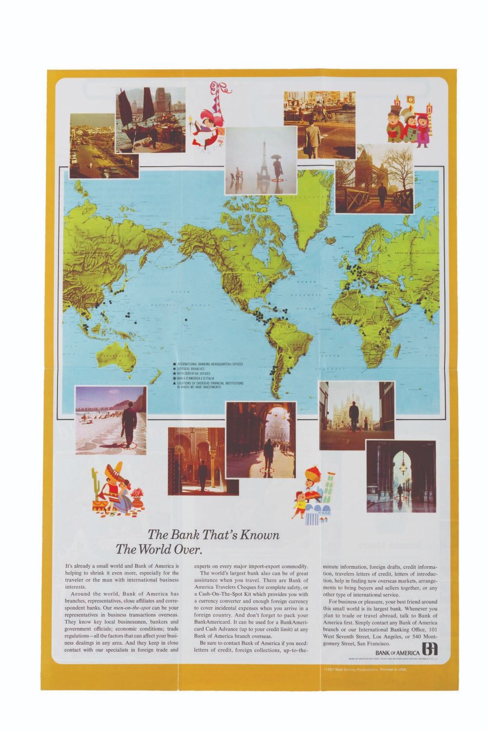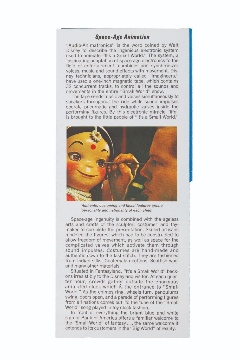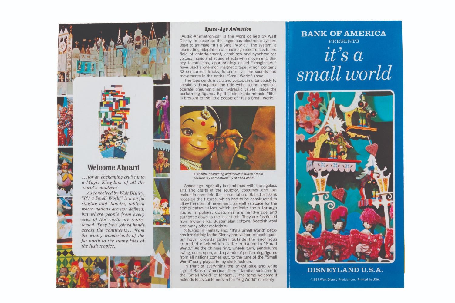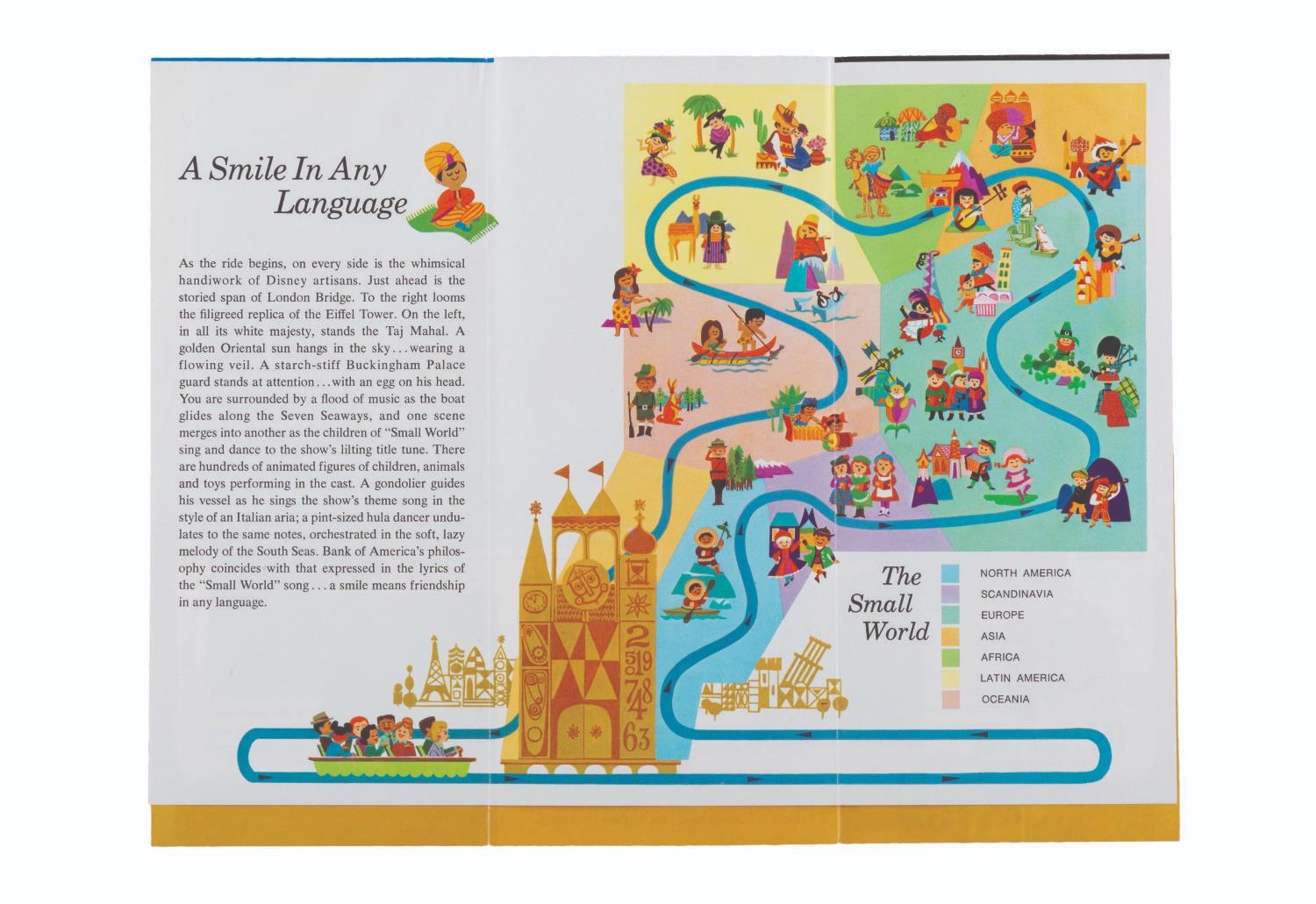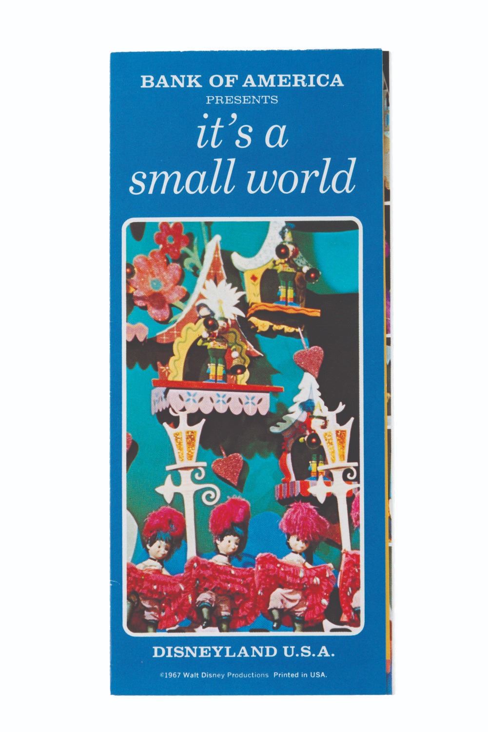 (Disneyland, 1967) A brochure from the early days of It's a Small World, presented by Bank of America, featuring a guide to which continents appear at what part in the ride. Measuring 3.75 " x 8.5 ", the brochure displays in very good condition with light creases and handling wear.