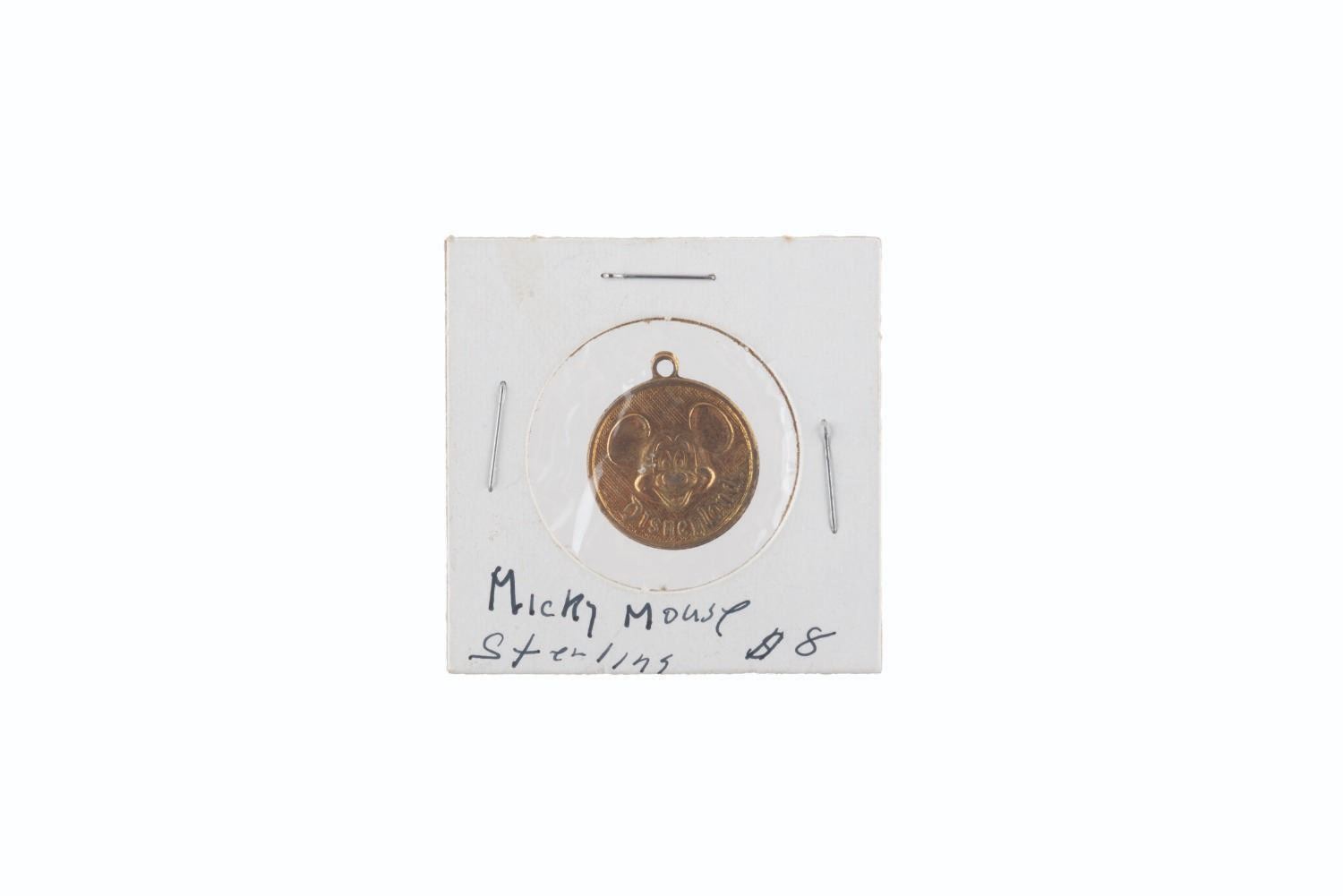 (Disneyland, 1950s-60s) A gold-plated sterling silver Mickey Mouse charm from Disneyland. Measuring 0.75 " in diameter, the charm is stamped "Sterling " on the reverse and is in good condition with spots of oxidation, tarnish, and plating loss.